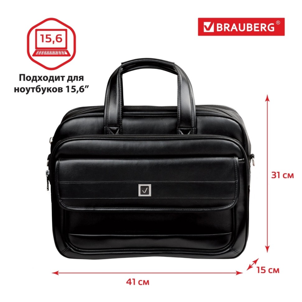 Данная модель, благодаря элегантному классическому дизайну, отлично подходит к деловому дресс-коду и станет незаменимым спутником во время бизнес-поездок и командировок. Размеры сумки с легкостью позволят взять ее на борт самолета в качестве ручной клади. Совместим с диагоналями экрана: 13", 14", 15". Количество внутренних отделений: 3 шт. Количество внешних карманов: 2 шт. Тип расположения устройства: отделение с усиленными стенками. Ремень для закрепления на ручке сумки-пилота: да. Регулируемый плечевой ремень: да. Крепление ремня: металл. Материал: искусственная кожа. Цвет: черный. Высота: 31 см. Ширина: 41 см. Глубина: 15 см. Вес: 1160 г Бренд - BRAUBERG. Производитель - Китай. Артикул - 240511. Штрихкод - 4606224100388