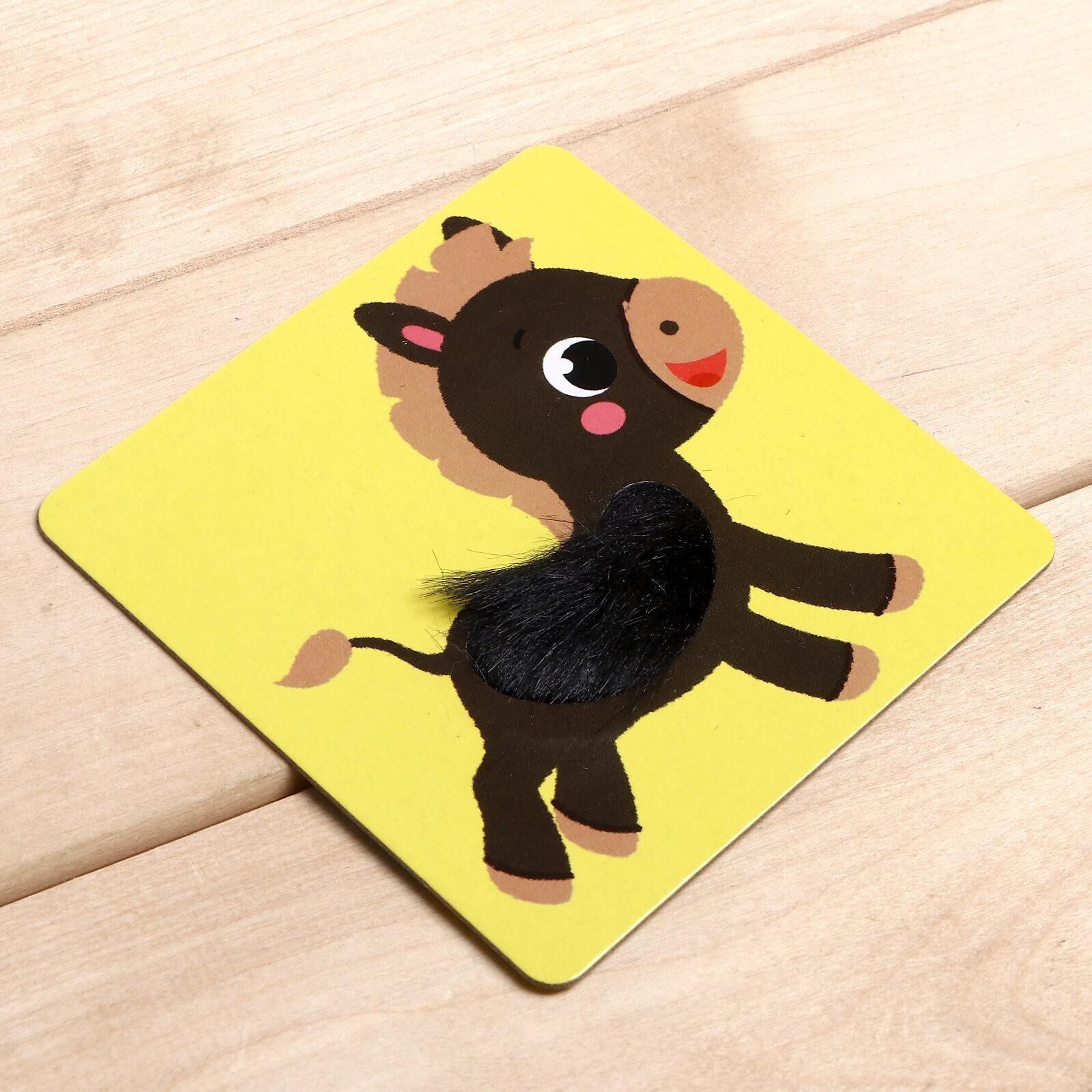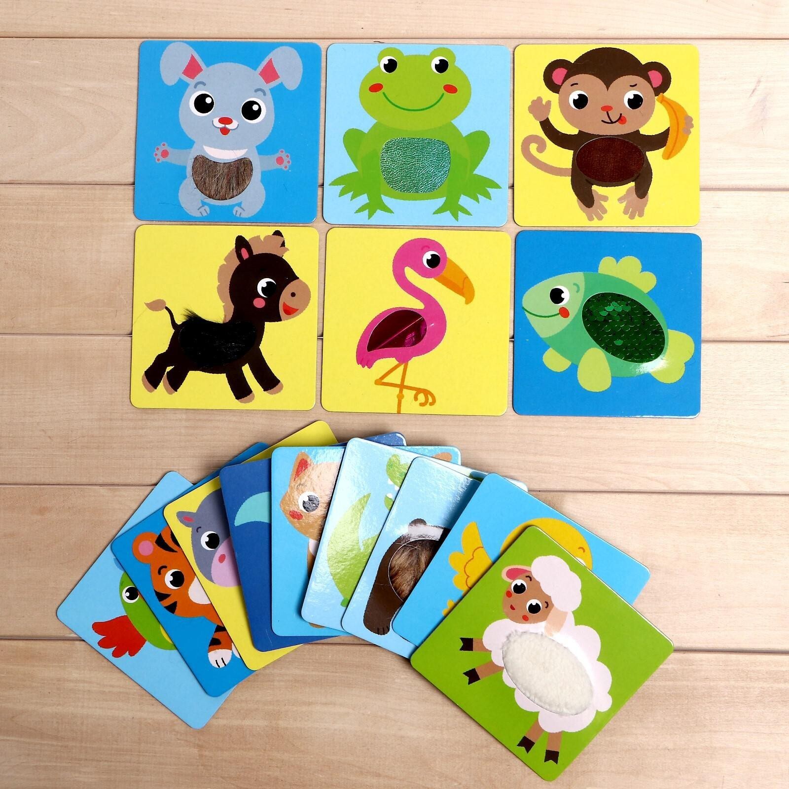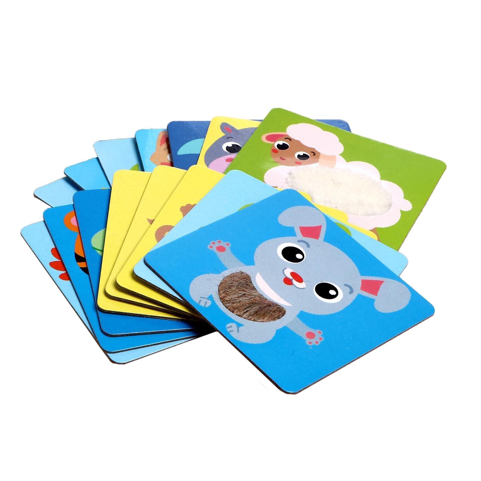 В этой необычной игре есть множество тактильных элементов на карточках с животными. Они представлены вкладками, соответствующими поверхности тела каждого зверька.