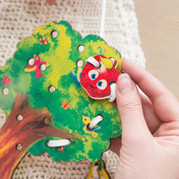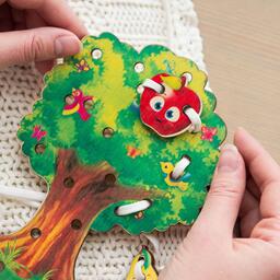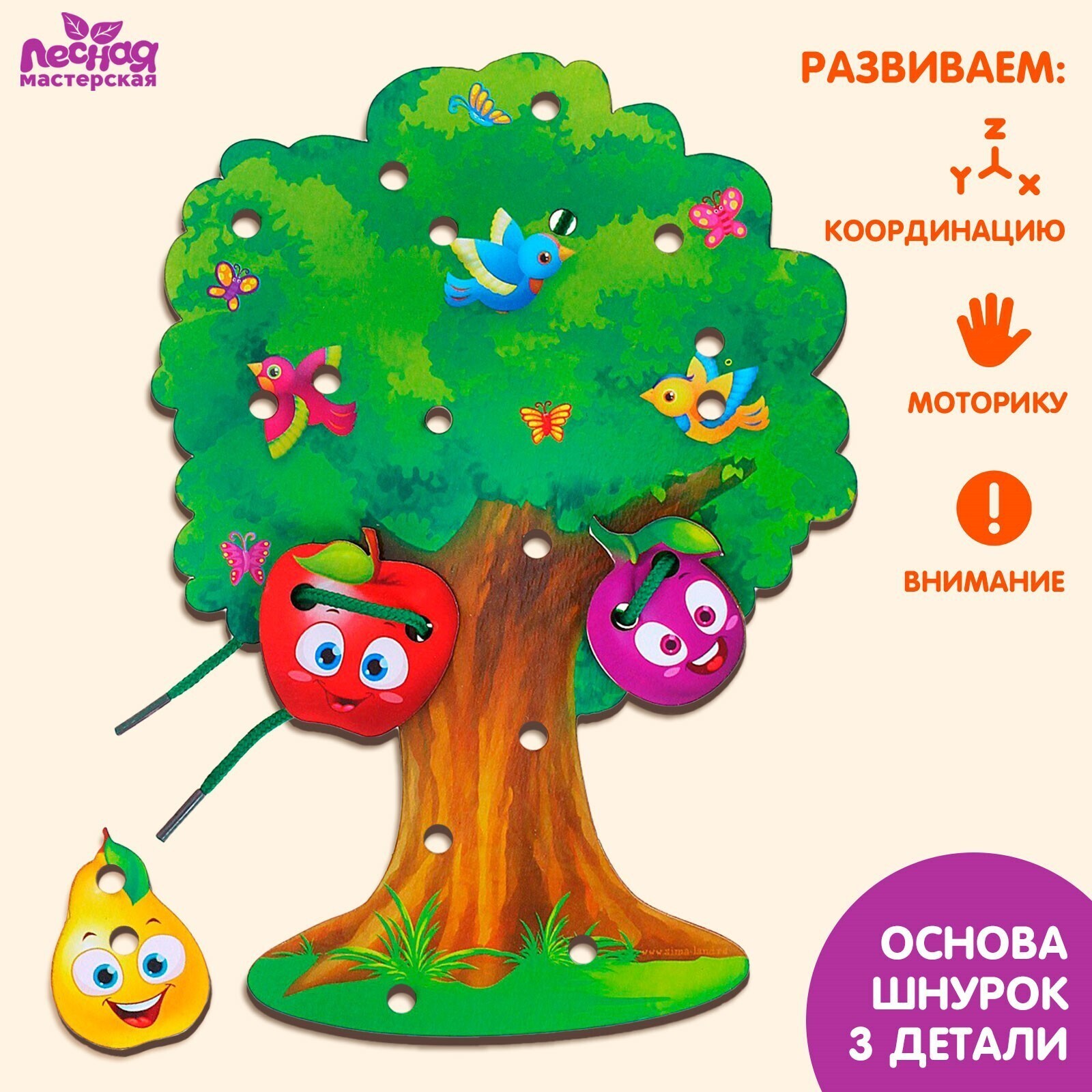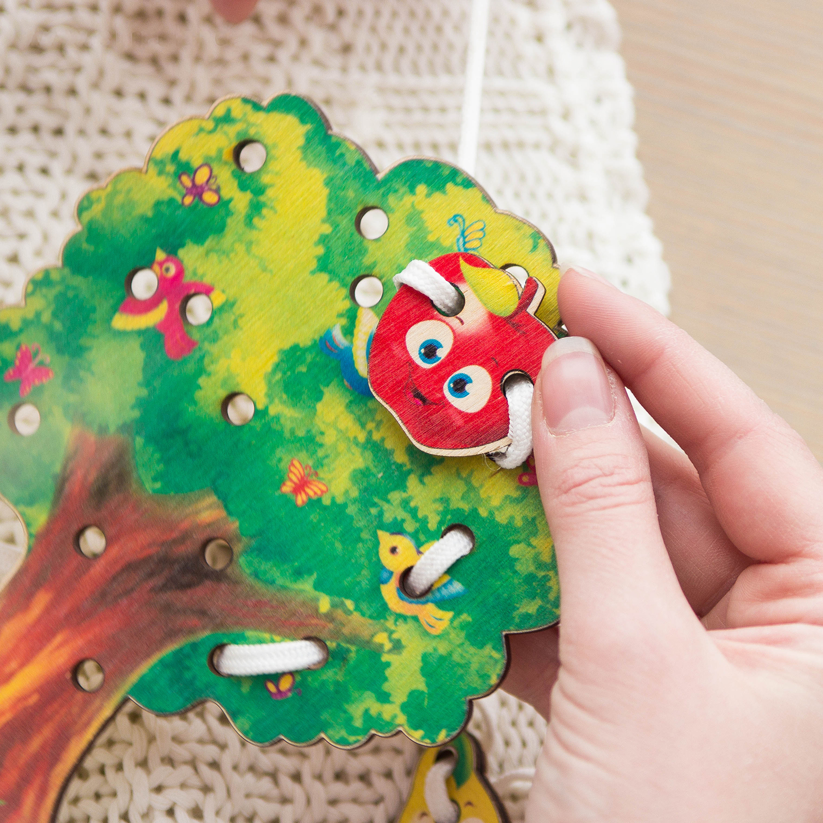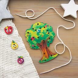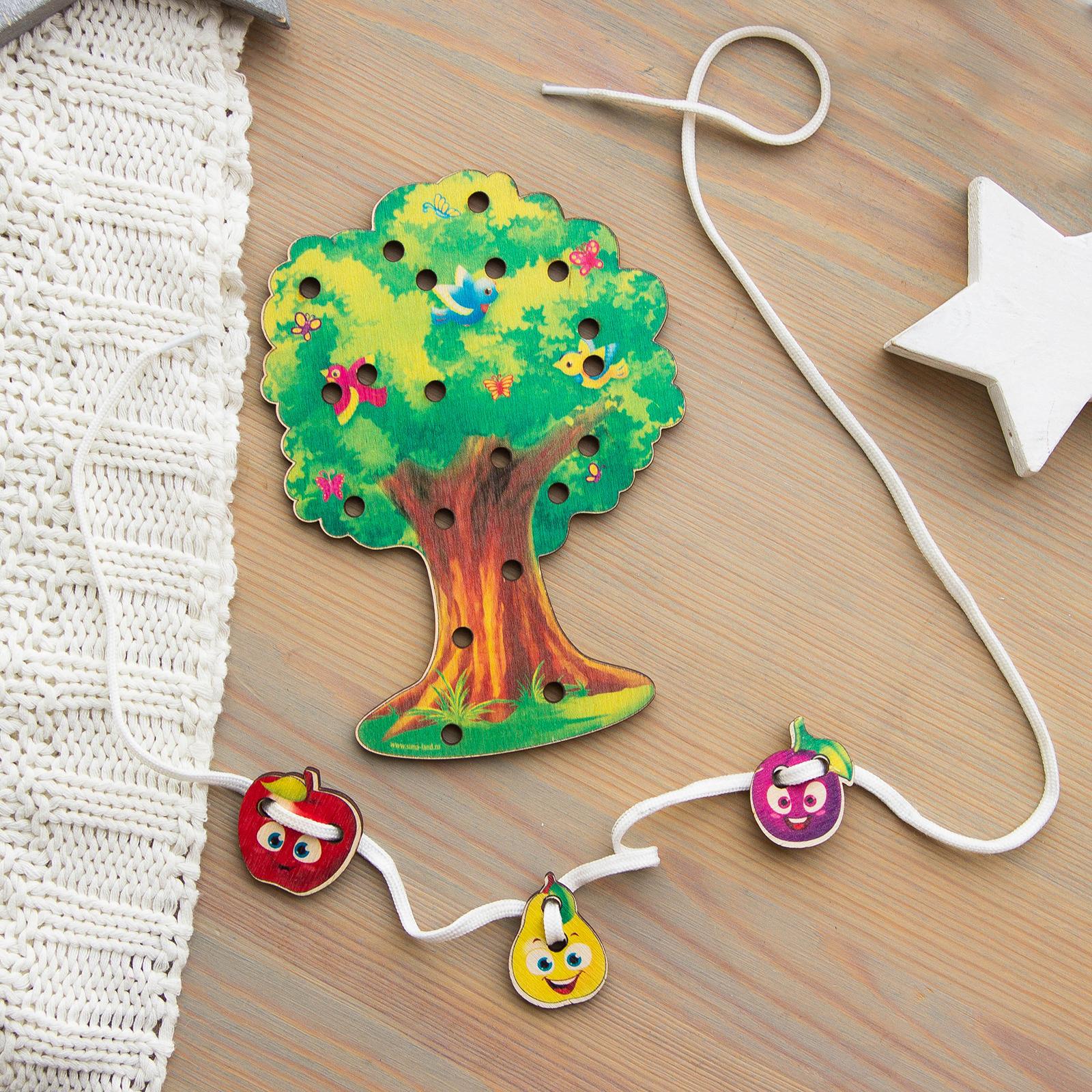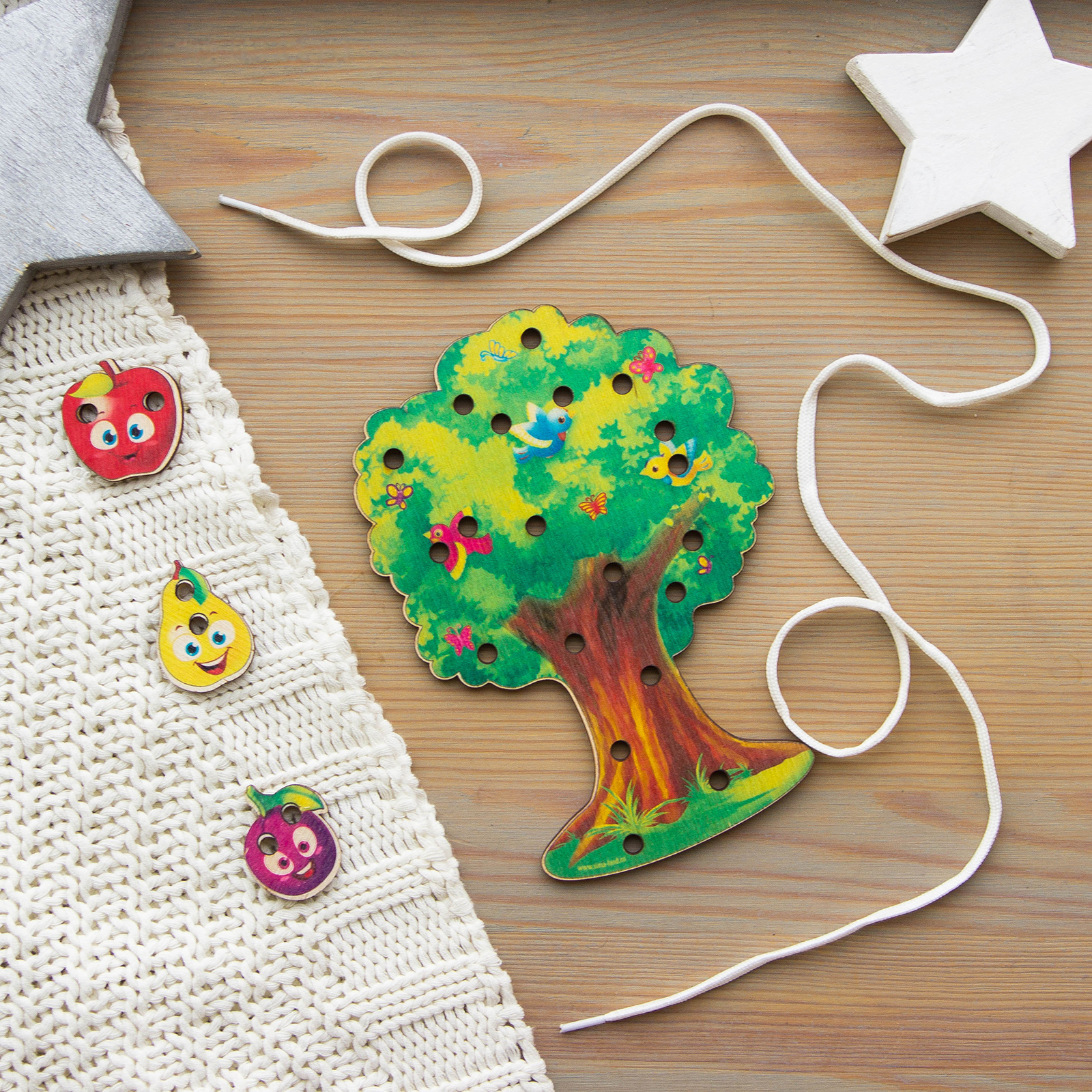 Ваш малыш – любитель присоединить друг к другу детали? Привязать, приклеить, прилепить – это так увлекательно и интересно! В таком случае деревянная игрушка-шнуровка «Фруктовое дерево» станет прекрасным подарком для Вашей крохи. Она поможет малышу запомнить, какие бывают фрукты, какого они цвета, формы и как растут. Фруктики, словно настоящие, цвета картинки яркие и насыщенные, это увлечет вашего ребенка надолго!