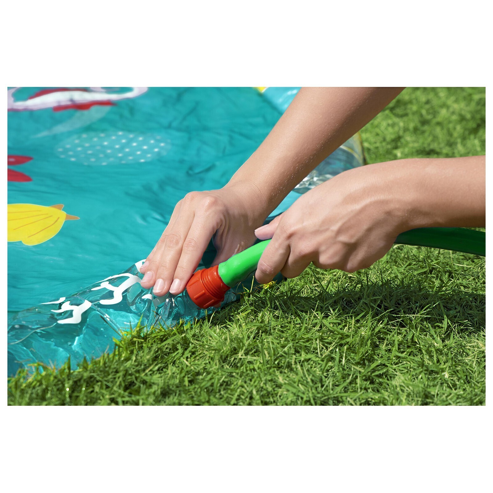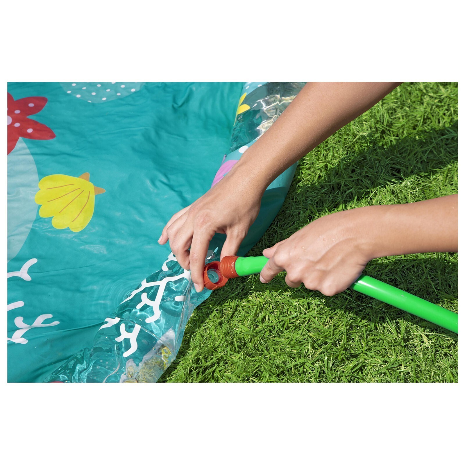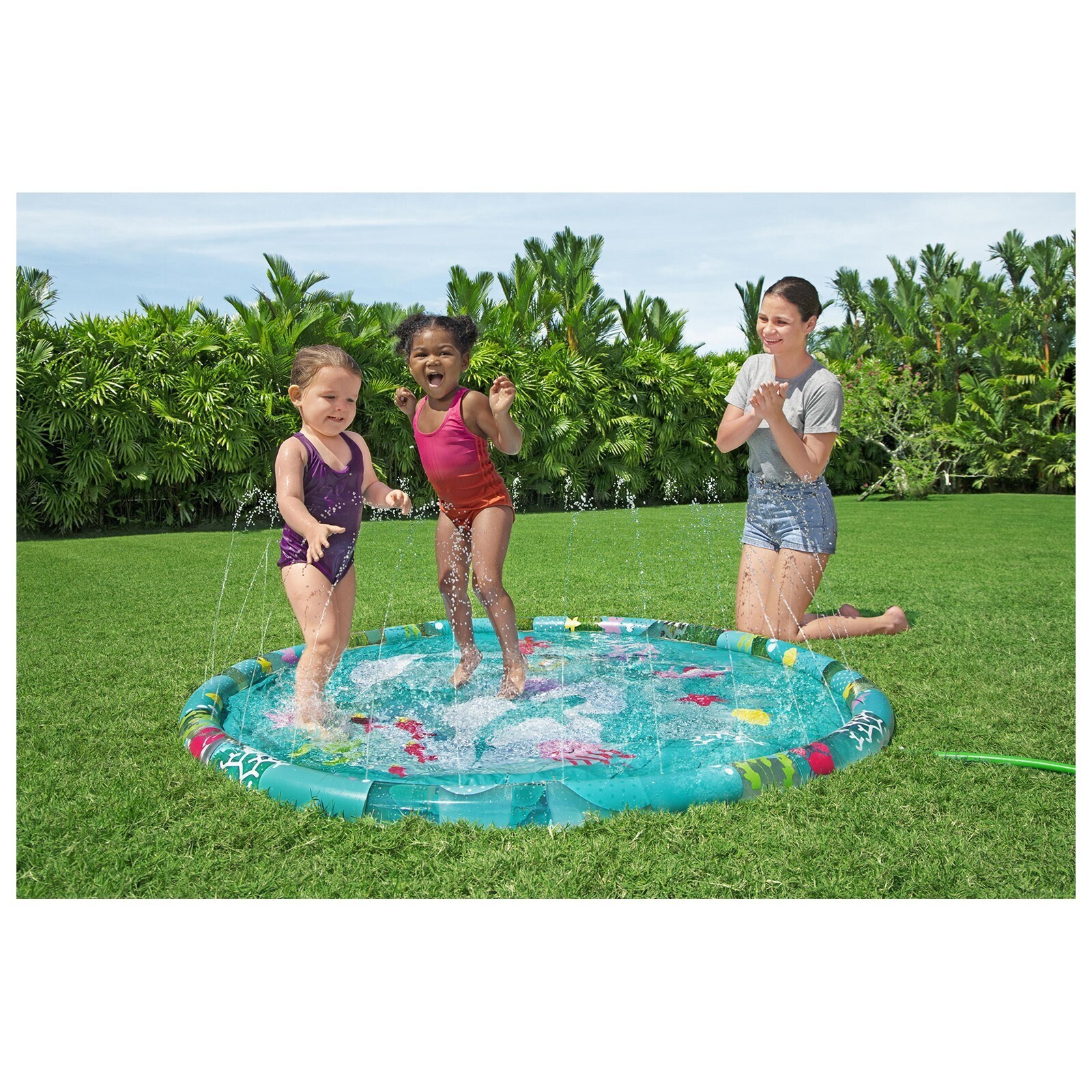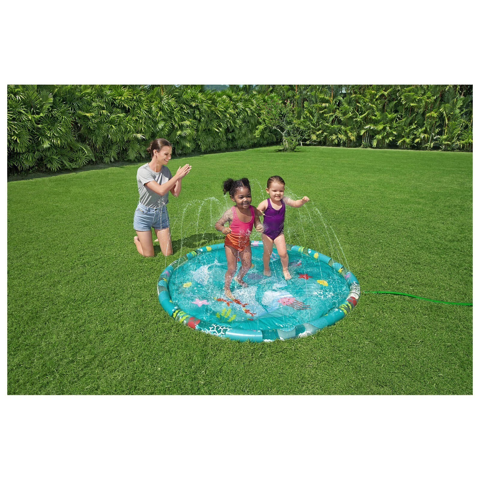 Детский надувной бассейн представляет собой водный коврик с разбрызгивателем. Изделие можно разместить в любом месте придомового участка. Для работы разбрызгивателя подключите бассейн к садовому шлангу.