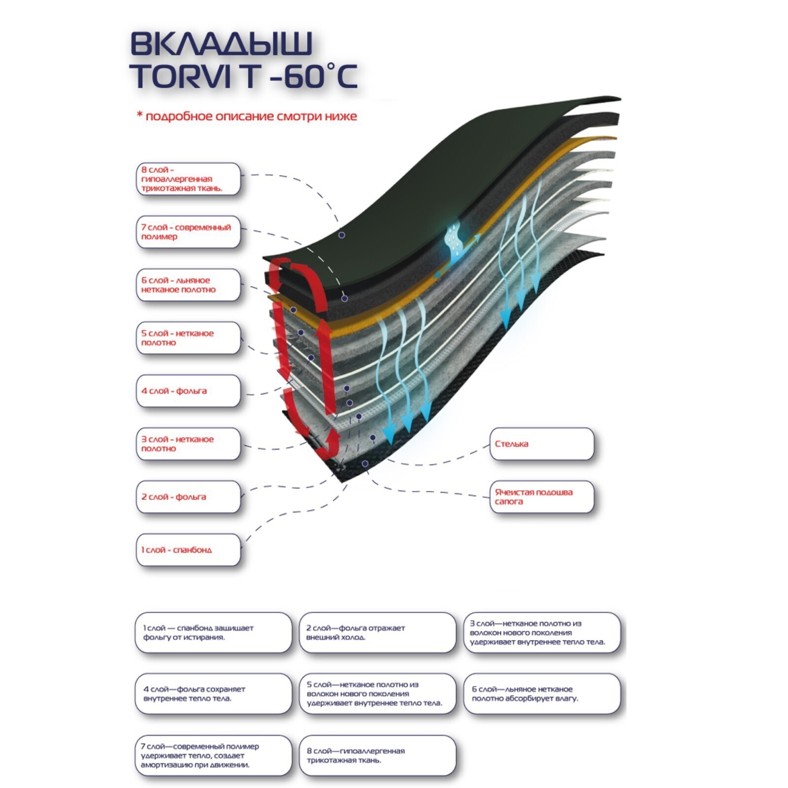 Все слои материала создают систему, надёжно отсекающую наружный холод и сберегающую тепло.