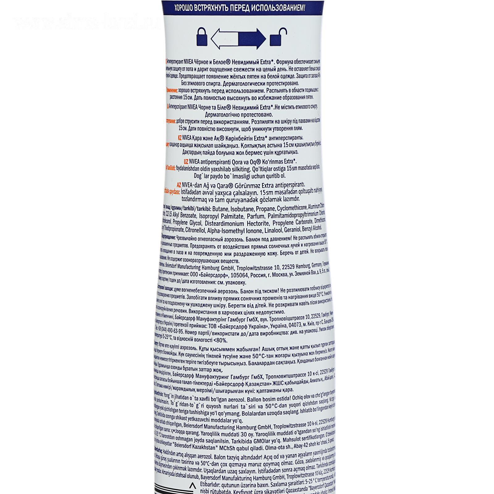 Описание: дезодорант-антиперспирант спрей NIVEA Черное и Белое Невидимый Extra предотвращает появление белых пятен на темной одежде и желтых пятен на светлой одежде. Черная одежда остается черной, а белая одежда дольше остается белой. Уникальная формула имеет 5 факторов защиты: от запаха, пота, пятен, следов и раздражения. Защищает кожу подмышек в течение 48 часов от пота и неприятного запаха. Этот чистый, кристальный и яркий сладковатый аромат - выражение естественной женственности. Не содержит этилового спирта. Сильная защита и забота о коже от Nivea на каждый день!