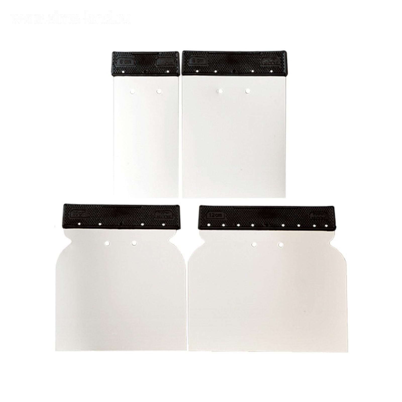 В составе набор шпателей для шпатлевания 4 шт.: 1х50 мм., 1х80 мм., 1х100 мм., 1х120 мм.