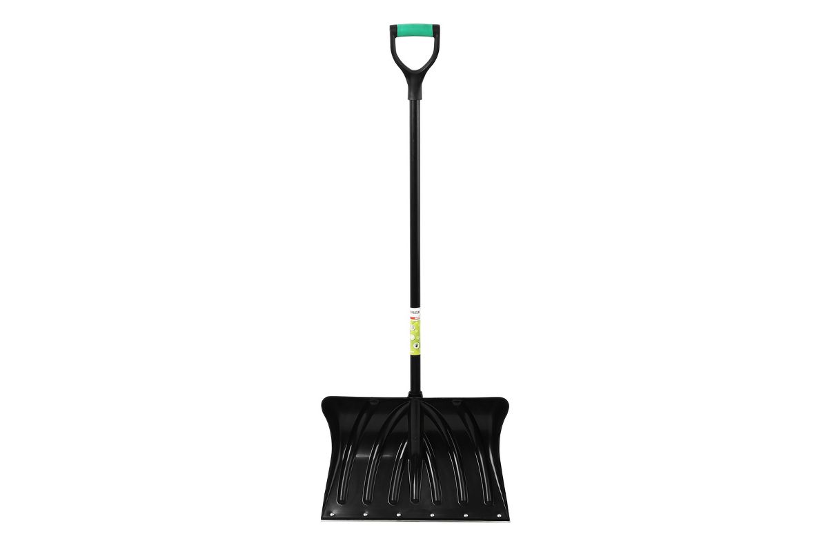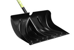 Снеговая лопата имеющая широкий и глубокий ковш из морозостойкого пластика.
