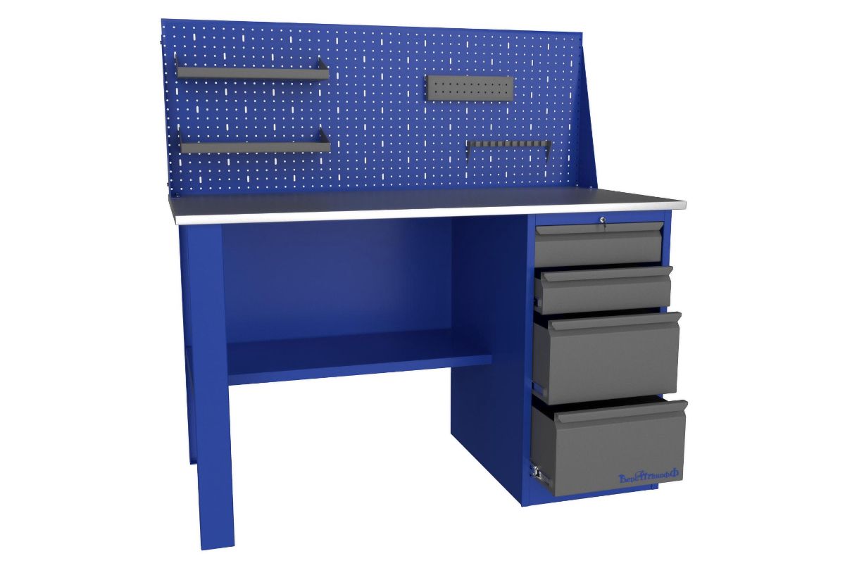 (ВхШхГ)870х1400х700. Состоит из: Столешница (фанера 24 мм. + оцинкованный металл 1мм); Тумба с 4-я выдвижными ящиками; Опора; Полка-стенка; Экран с комплектом навесок.