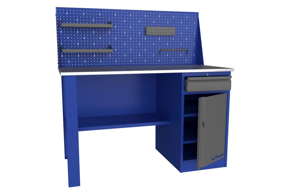 (ВхШхГ)870х1400х700. Состоит из: Столешница (фанера 24 мм. + оцинкованный металл 1мм); Тумба с дверцей и ящиком; Опора; Полка-стенка; Экран с комплектом навесок.