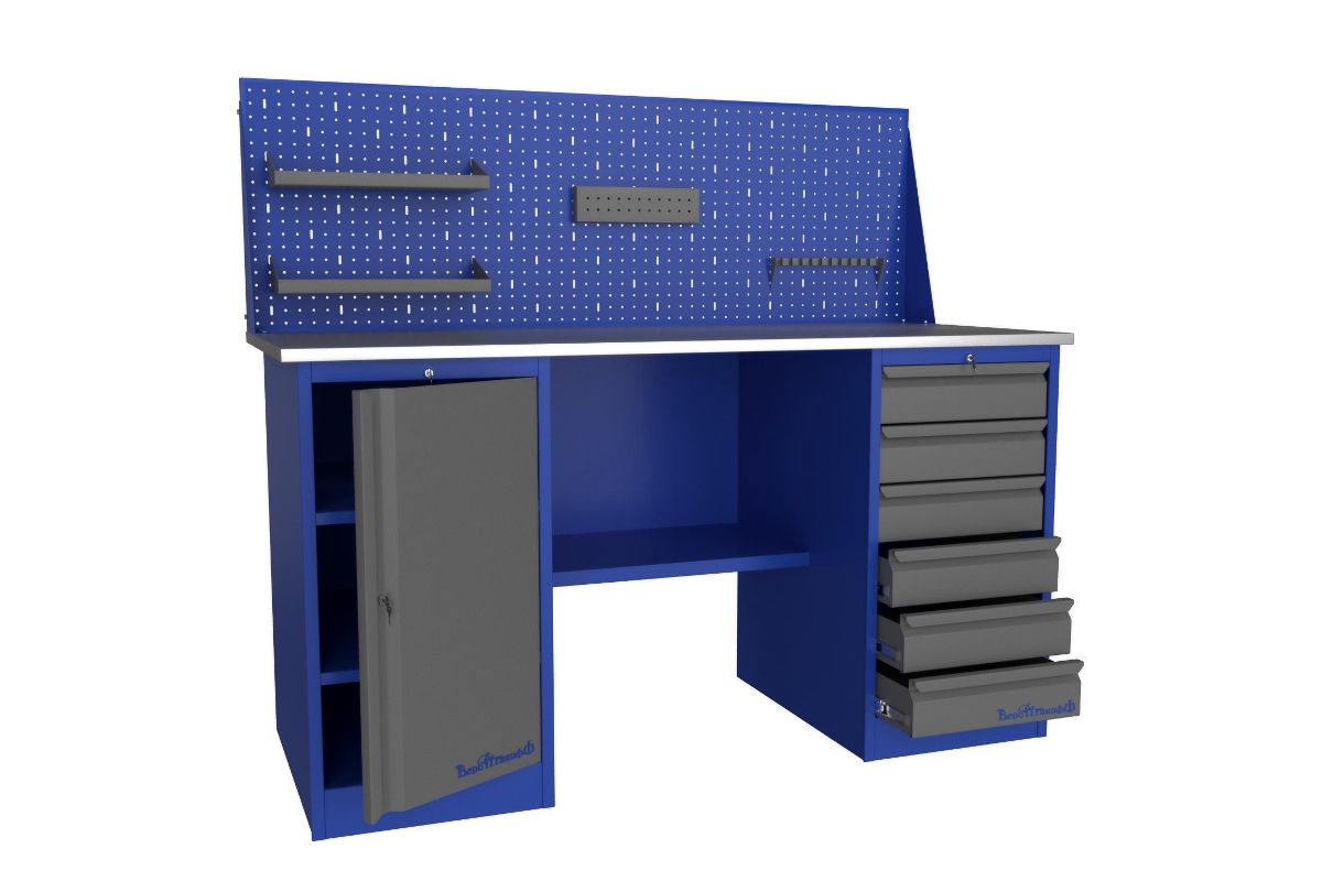 (ВхШхГ)870х1600х700. Состоит из: Столешница (фанера 24 мм. + оцинкованный металл 1мм);Тумба с дверцей; Тумба с 6-ю выдвижными ящиками; Полка-стенка; Экран с комплектом навесок.