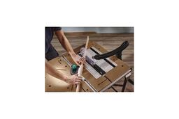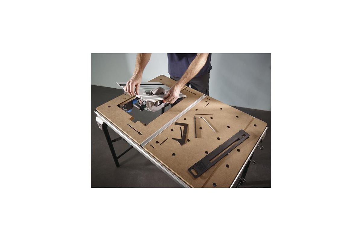 - Рабочая поверхность из алюминия даёт возможность быстро поменять настольную циркулярную пилу на управляемую циркулярную пилу с направляющей шиной.