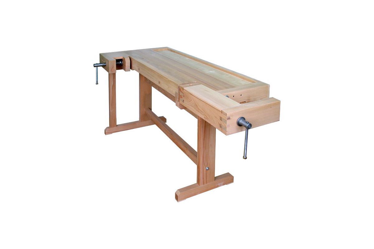 (ШхВхГ) 1400х840х790мм. Материал - сосна. Оборудован передними и боковыми тисками с металлическими винтами. Подверстачье верстака разборное, на деревянных клиньях. Вес - 39 кг.