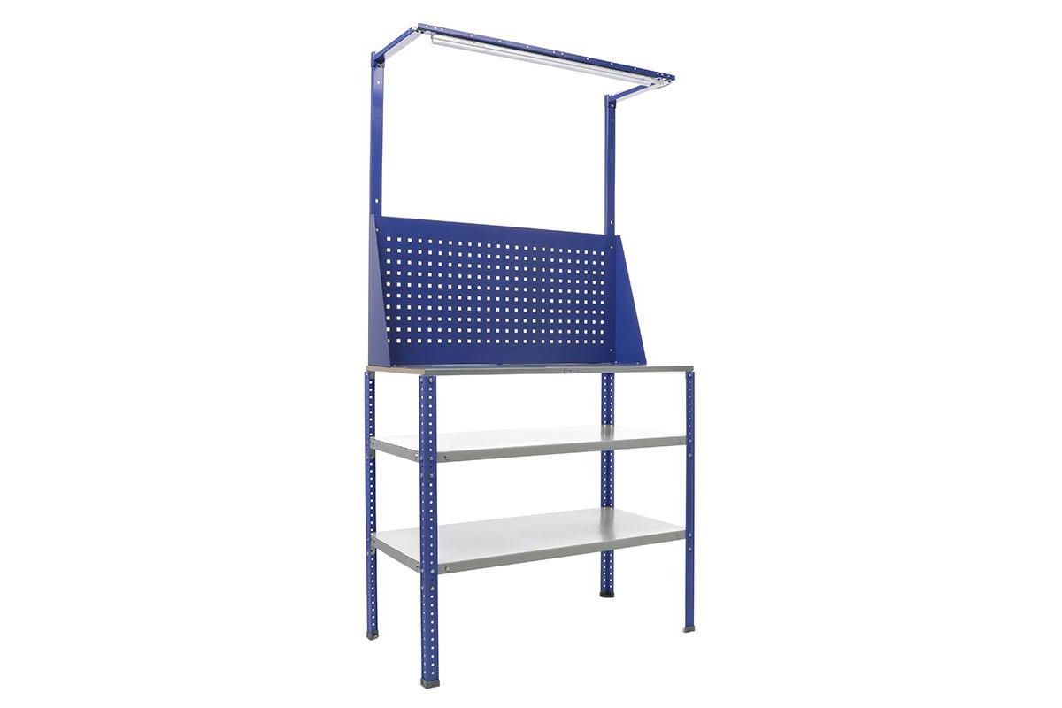 Размеры внешние, мм (ВхШхГ): 1980x1000x500, Вес, кг: 36, Количество полок: 2. Столешница выполнена из мебельного щита (сосна 18 мм), на верхней части щита установлена накладка из оцинкованного листа металла толщиной 1.2 мм, распределенная нагрузка 300 кг. Опоры изготовлены из стойки с профилем сечения 40х40 мм, толщина стали стоек 1,5 мм, шаг перфорации 50 мм. На опорах установлены пластиковые подпятники. Комлект верстака оснащен двумя полками с нагрузкой до 100 кг, экраном и комплектом освещения. Верстак можно дополнить ящиком (нагрузка 30 кг).