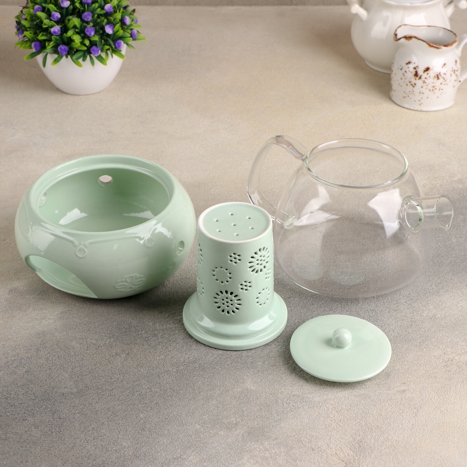 1. Стеклянный заварочный чайник с керамическим ситом, объем 700 мл.