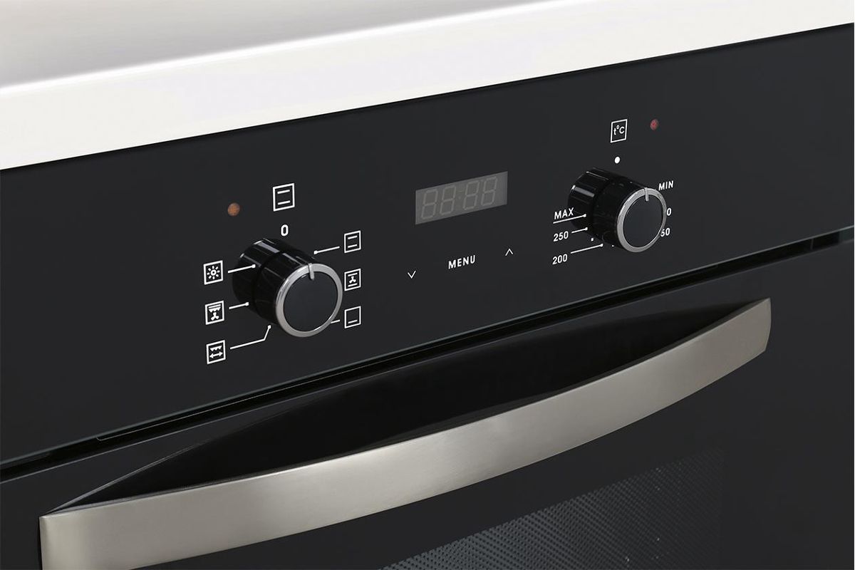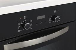 Духовой шкаф. Черный стеклянный фасад с рисунком, таймер электронный, ТЭН вентилятора (турбо-гриль), ТЭН-гриль, вертел с электроприводом, проволочные направляющие, телескопические полки, жировой фильтр, подсветка задняя, объемная подсветка
