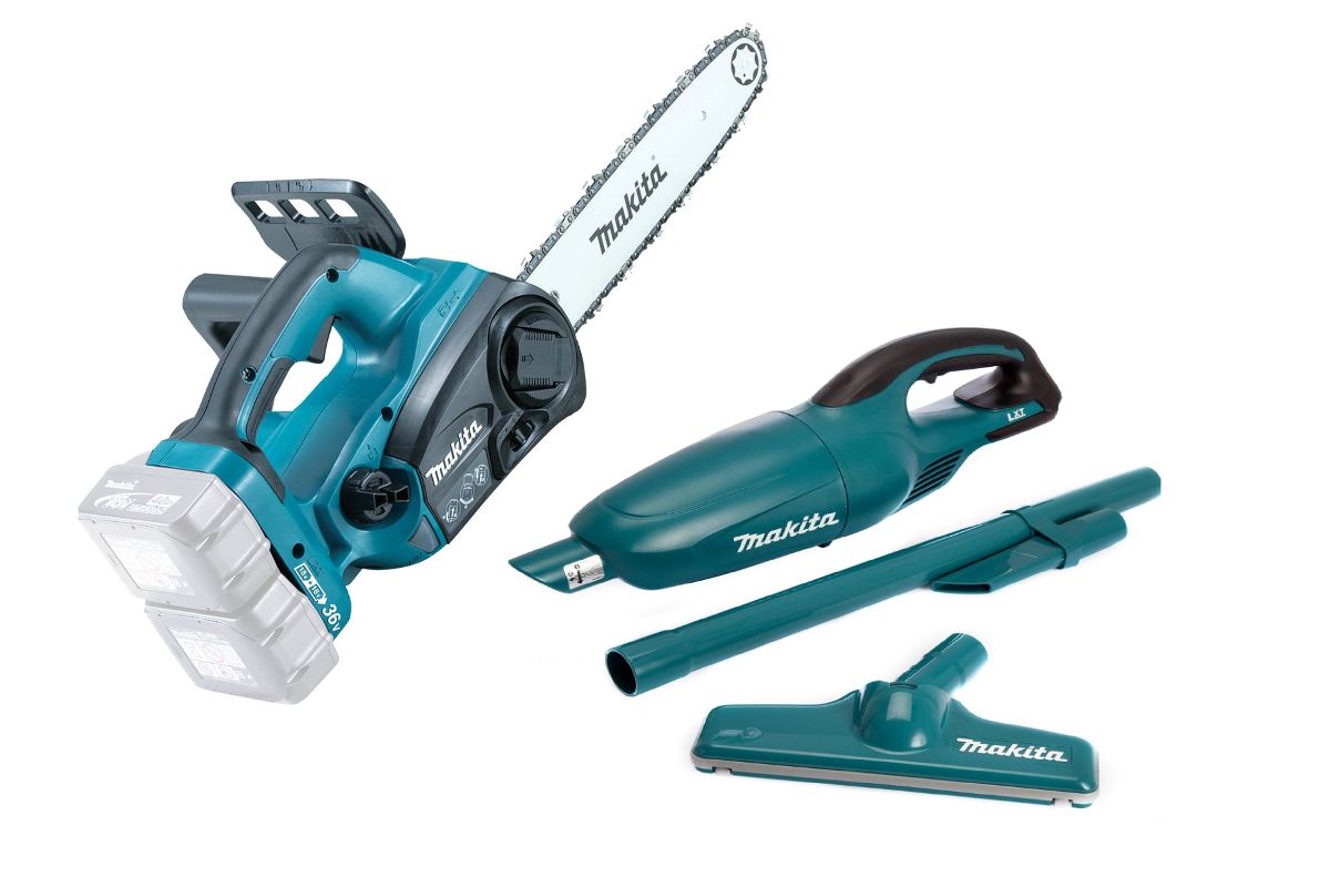 В набор входят два аккумуляторных инструмента MAKITA цепная пила DUC302Z и пылесос DCL180Z. Оба работают от 18 В аккумуляторов. Для пилы нужно сразу две батареи, для пылесоса – одна. Зарядное устройство и аккумуляторы приобретаются отдельно.
