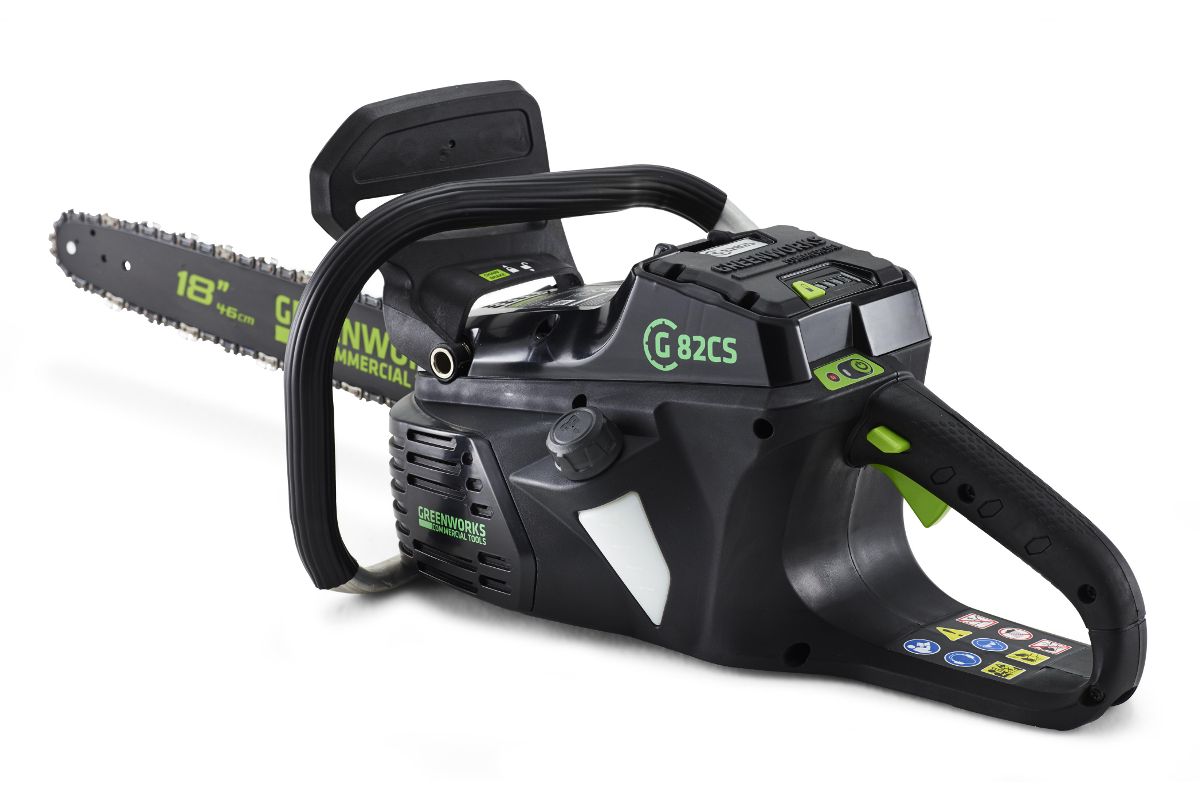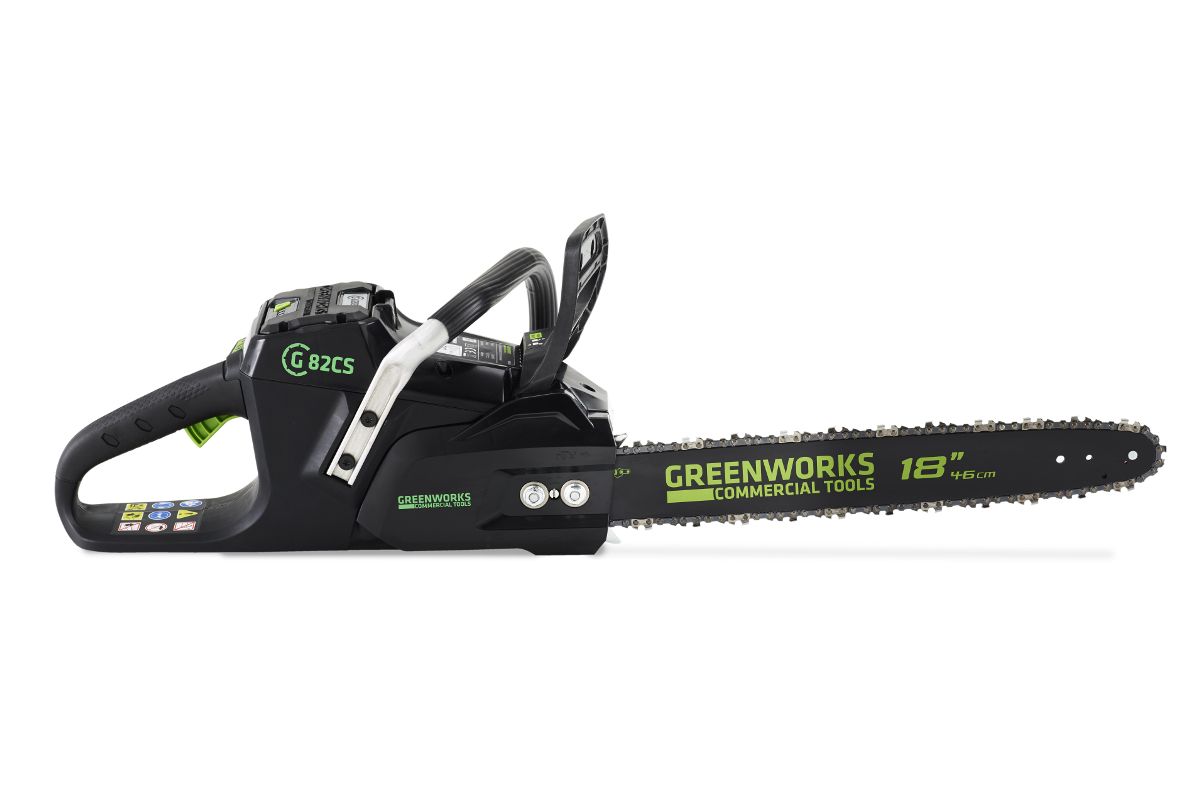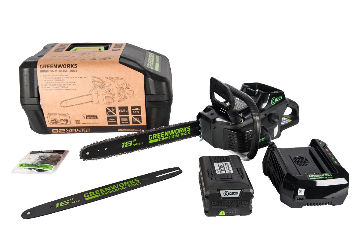 Цепная аккумуляторная пила GREENWORKS GС82CSK25 из линейки техники 82V Commercial — профессиональная цепная пила, которая отлично работает с любой древесиной.
