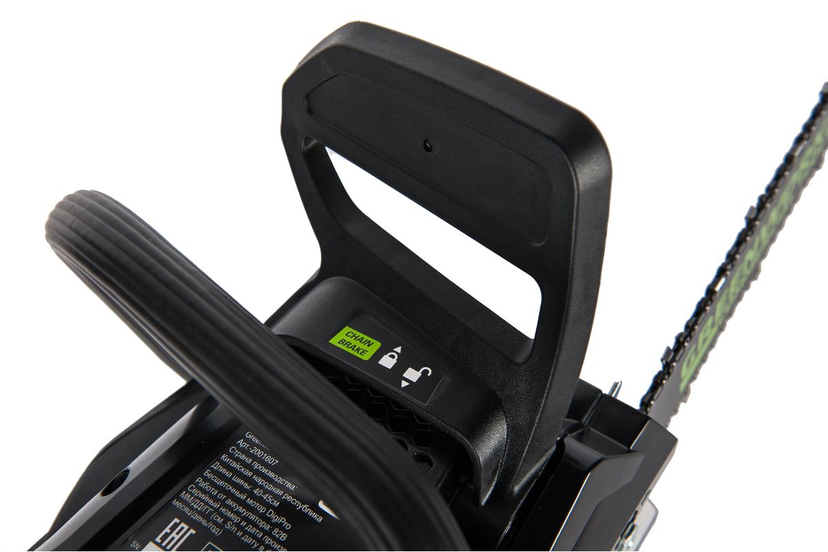 Ее надёжный бесщёточный двигатель серии DigiPro сопоставим по мощности с бензиновыми аналогами на 2,5-3 л/с. Но особенность электрического двигателя — это высокий крутящий момент и автоматическая регулировка оборотов, что позволяет пилить быстрее бензиновых пил. Его также отличает низкий уровень шума и отсутствие вибраций, абсолютная экологичность, а так же простота в эксплуатации — не требуется подготовка горючей и взрывоопасной масляно-бензиновой смеси и вообще какого-либо обслуживания. Для долговечной работы двигатель имеет защиту от перегрузки. И его не нужно заводить, пила включается нажатием всего одной кнопки.