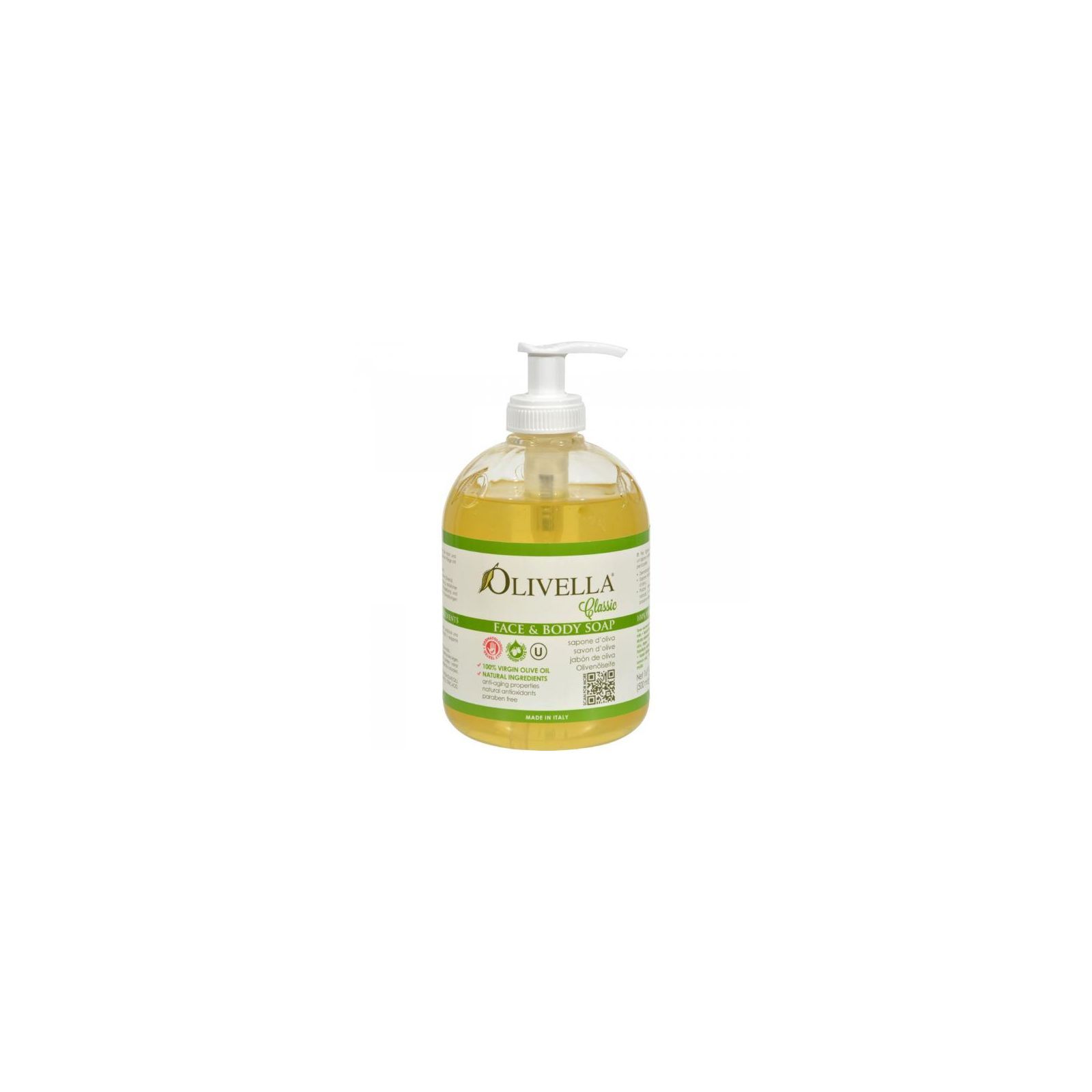 Рідке мило OLIVELLA на основі 100% оливкової олії завдяки запатентованій інноваційній формулі навіть у разі частого застосування ніжно очищає навіть найчутливішу шкіру, водночас здійснюючи поживну, пом'якшувальну та заспокійливу дію на шкіру. Рідке мило OLIVELLA повністю рослинного походження, що отримується завдяки обмиленню оливкової олії Virgin без додавання будь-яких інгредієнтів тваринного походження, барвників та консервантів, підходить для застосування в будь-якому віці, від діточок — заспокоюючи ніжну шкіру немовлят, до бабусь і дідусів — здійснюючи омолоджувальну антиоксидантну дію. Добре очищає, не залишаючи оліїстого залишку. Чудово підходить для вмивання обличчя, миття рук і тіла для всіх типів шкіри. Вже після першого застосування Ви помітите, що Ваша шкіра стала м'якшою, а завдяки глибокому очищенню пор, шкіра — більш доглянутою і гладкою.