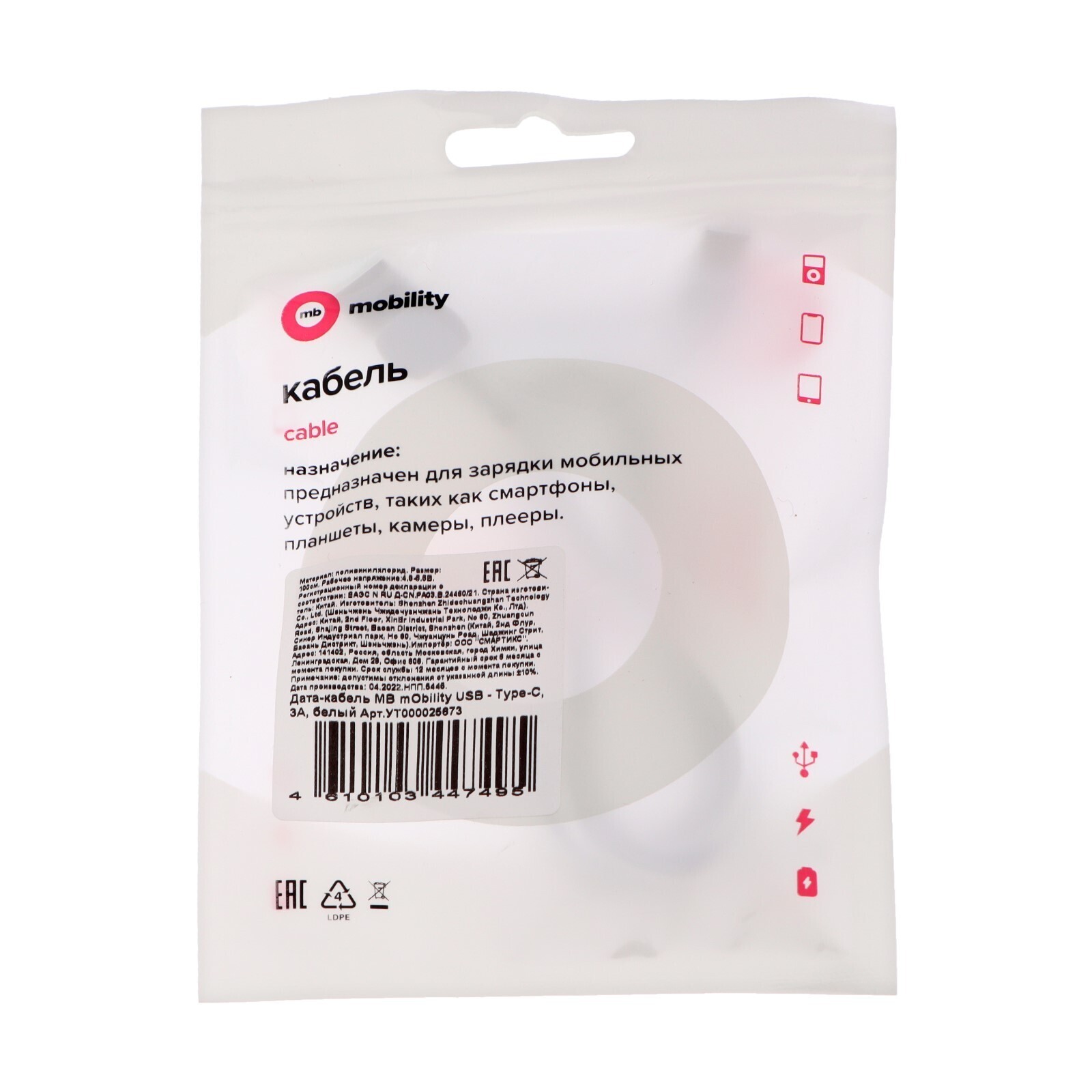 Кабель MB mObility, Type-C - USB, 3 А, 1 м, белый