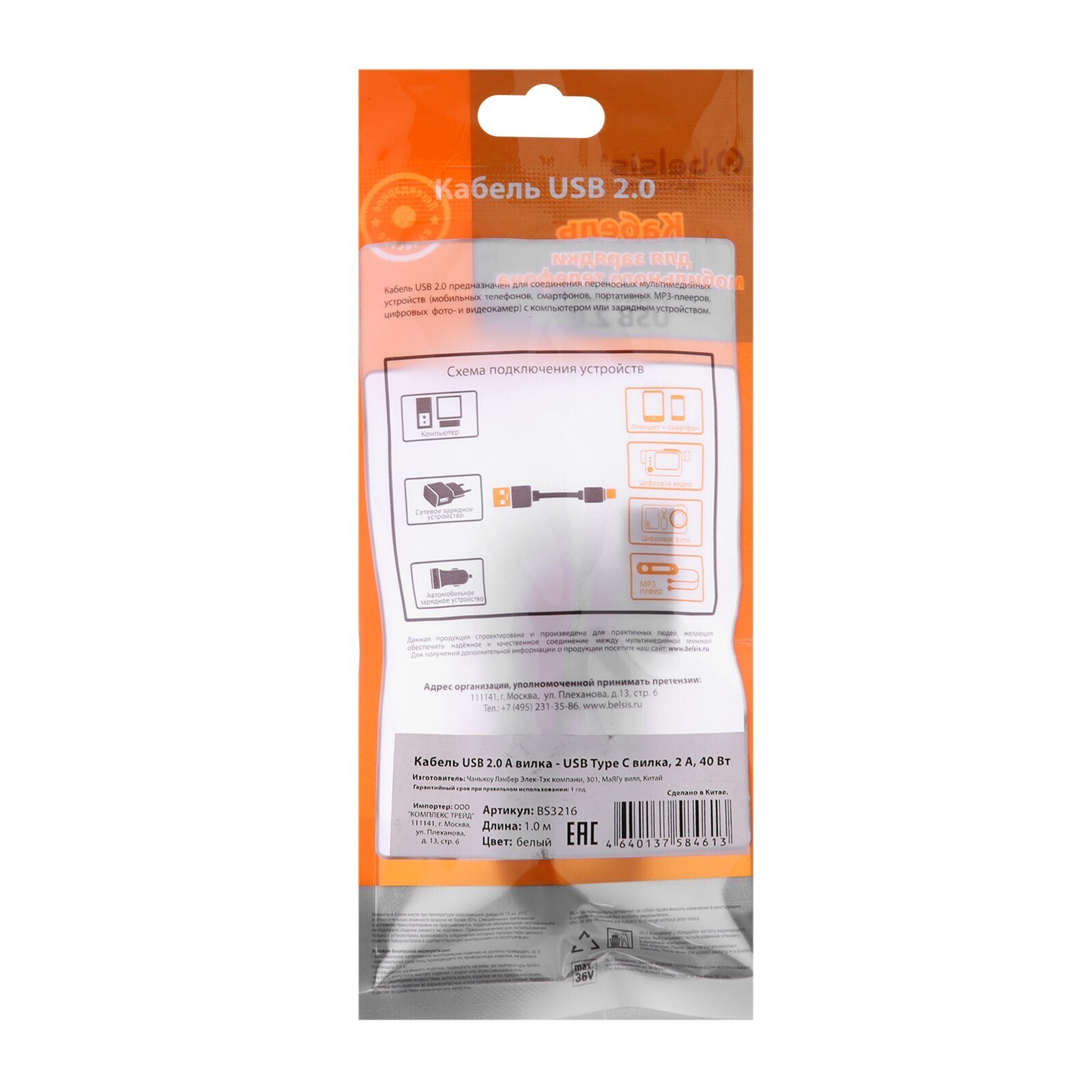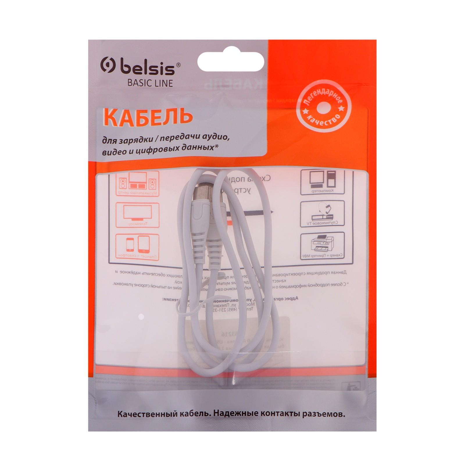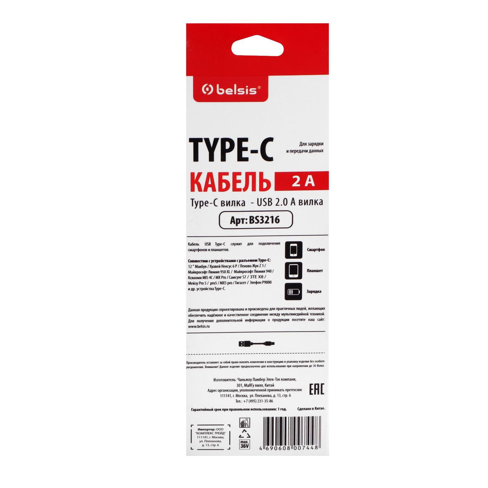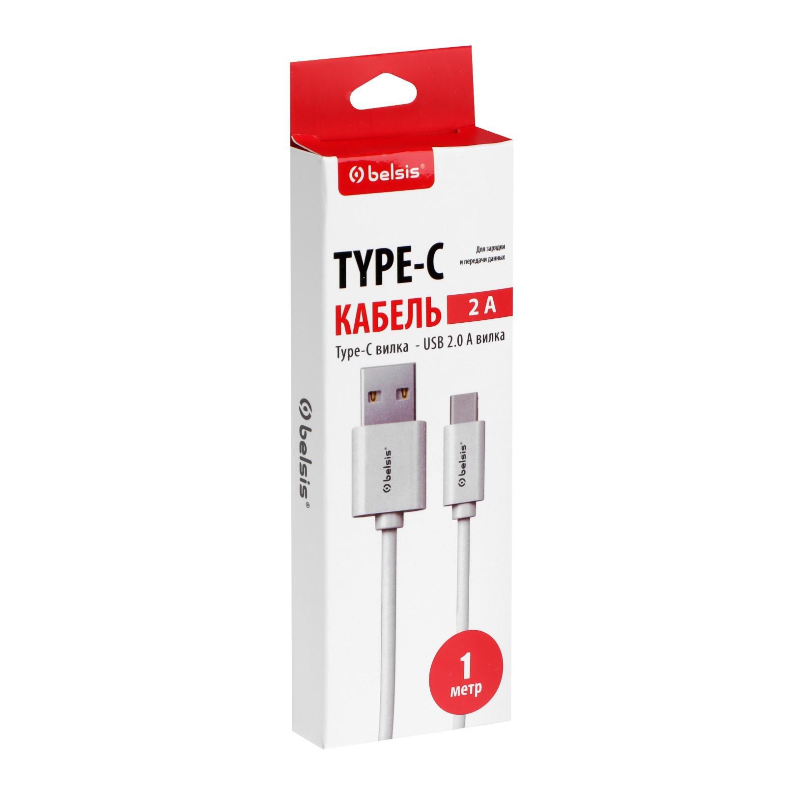 Кабель Belsis BS3216, Type-C - USB, 2 А, 1 м, быстрая зарядка, передача данных, белый