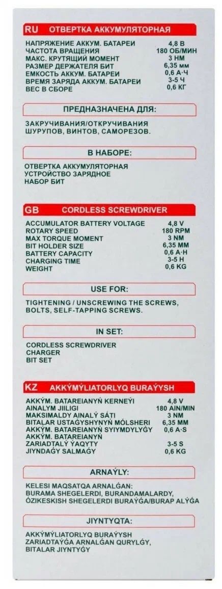 Аккумуляторная отвертка FIT 80237 пригодится при сборке или ремонте мебели, отделочных работах и т. д. Предусмотрена подсветка рабочей зоны при эксплуатации инструмента в затемненных помещениях. Для удобного использования имеется магнитная фиксация бит и индикатор заряда батареи. Технические характеристики FIT 80237 Наличие реверса да Наличие подсветки да Max крутящий момент , Нм 3 Жестк. вращ. момент, Нм 3 Тип аккумулятора Li-lon Напряжение аккумулятора, В Напряжением аккумулятора отвертки принято считать среднюю разность потенциалов при работе электрического поля внутри элемента. Измеряется в Вольтах (В). Величина изменяется у разных моделей от 1,2 до 7.2 В. Напряжение отражает то же свойство, как мощность - у сетевых устройств. Чем больше напряжение тем больше полезной энергии расходуется на функционирование устройства. Оно достигает пика сразу после полной зарядки аккумулятора и постепенно падает до отметки, когда включение устройства уже не возможно и требуется зарядить аппарат. Напряжение растрачивается и при пассивном хранении. Поэтому после длительного перерыва в использовании аккумулятор отвертки рекомендуется полностью зарядить.
