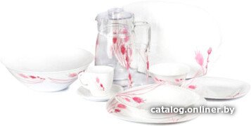 - Состав набора блюдо, блюдце (6 шт.), графин (с крышкой), салатник (большой — 1 шт., малый — 6 шт.), стакан (6 шт.), тарелка закусочная (десертная) (6 шт.), тарелка столовая глубокая (6 шт.), чашка (6 шт.), тарелка столовая обеденная (6 шт.)
