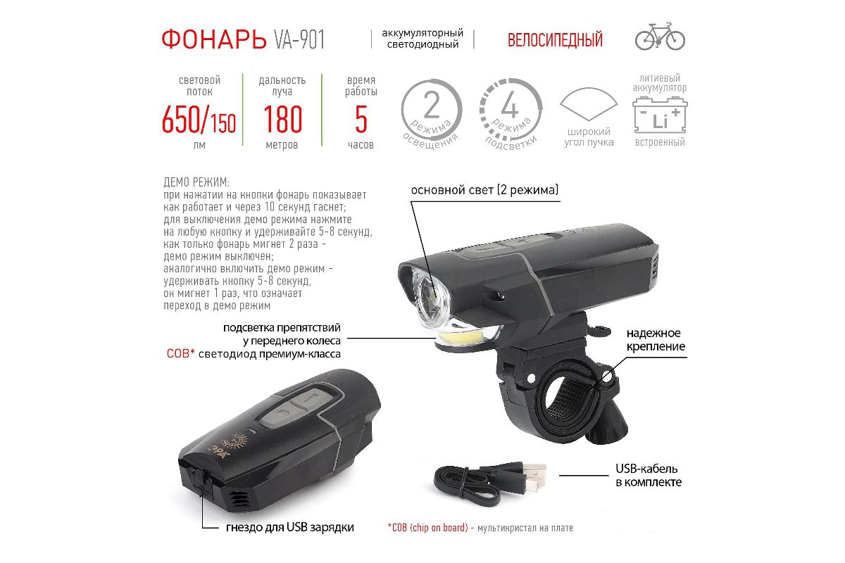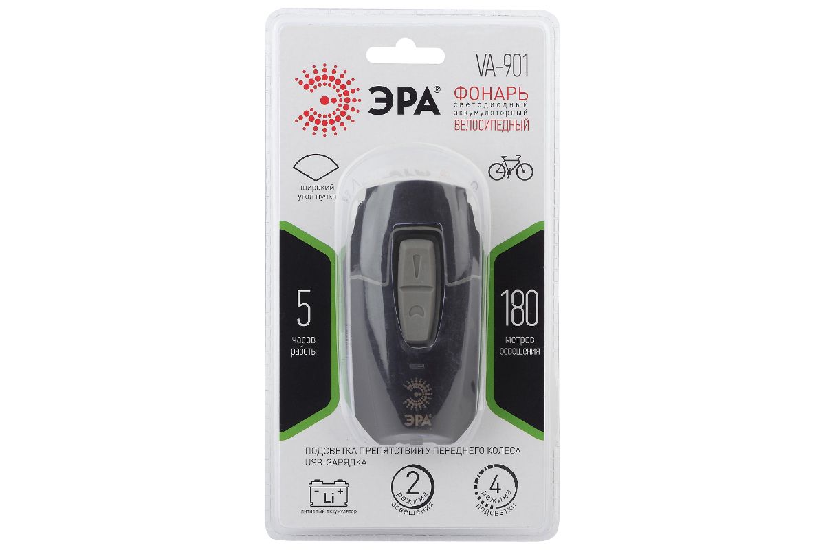 ЭРА VA-901 - светодиодный велосипедный фонарь на емком литиевом аккумуляторе. Не требует батареек и удобно заряжается от USB.
