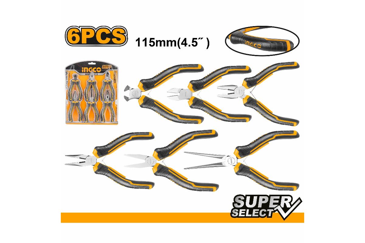 Набор плоскогубцев INGCO HMPS06115 Набор мини-плоскогубцев 6шт HMPS06115,разм:4,5'' Комбинированные плоскогубцы,4,5'' Диагональные кусачки,4,5'' Концевые кусачки
