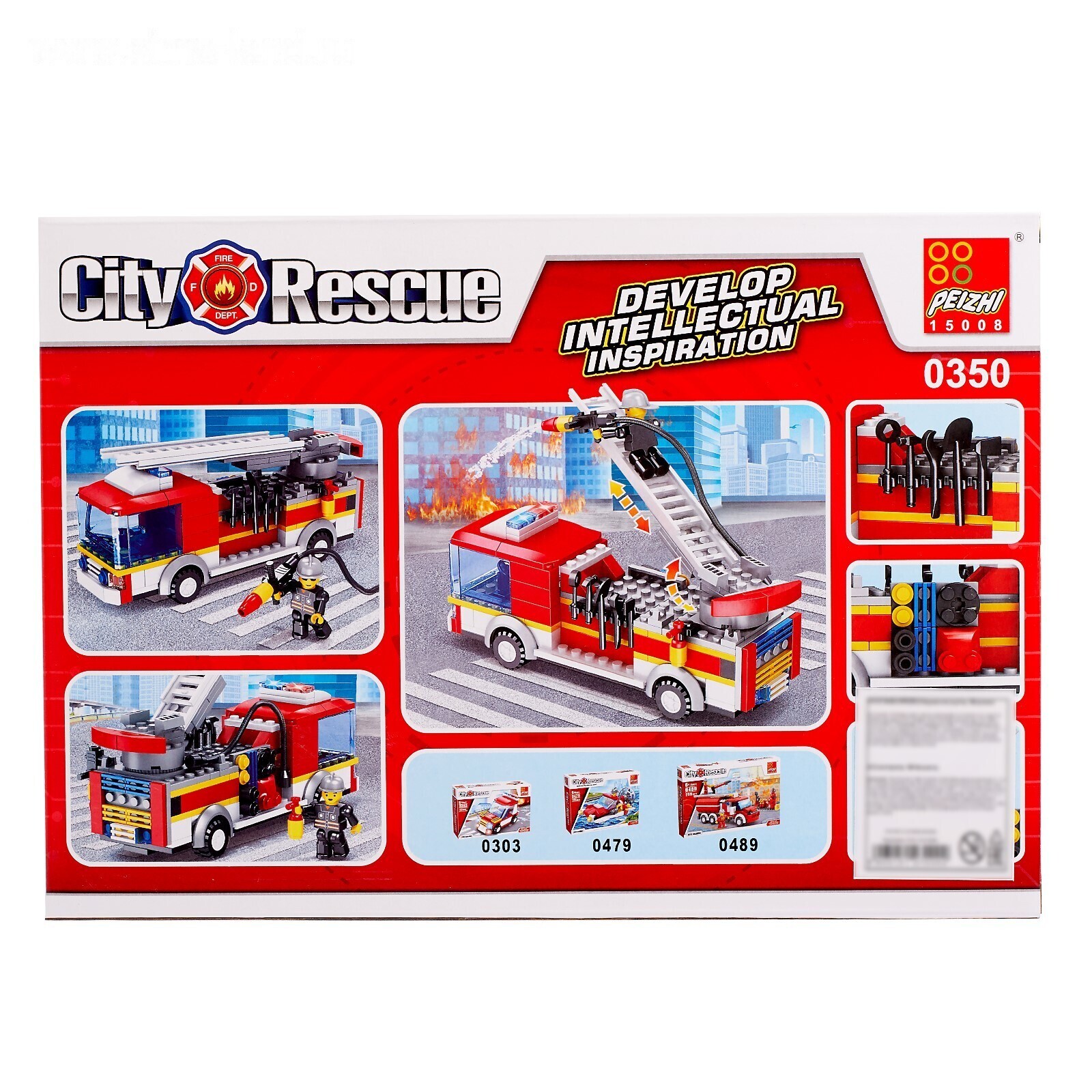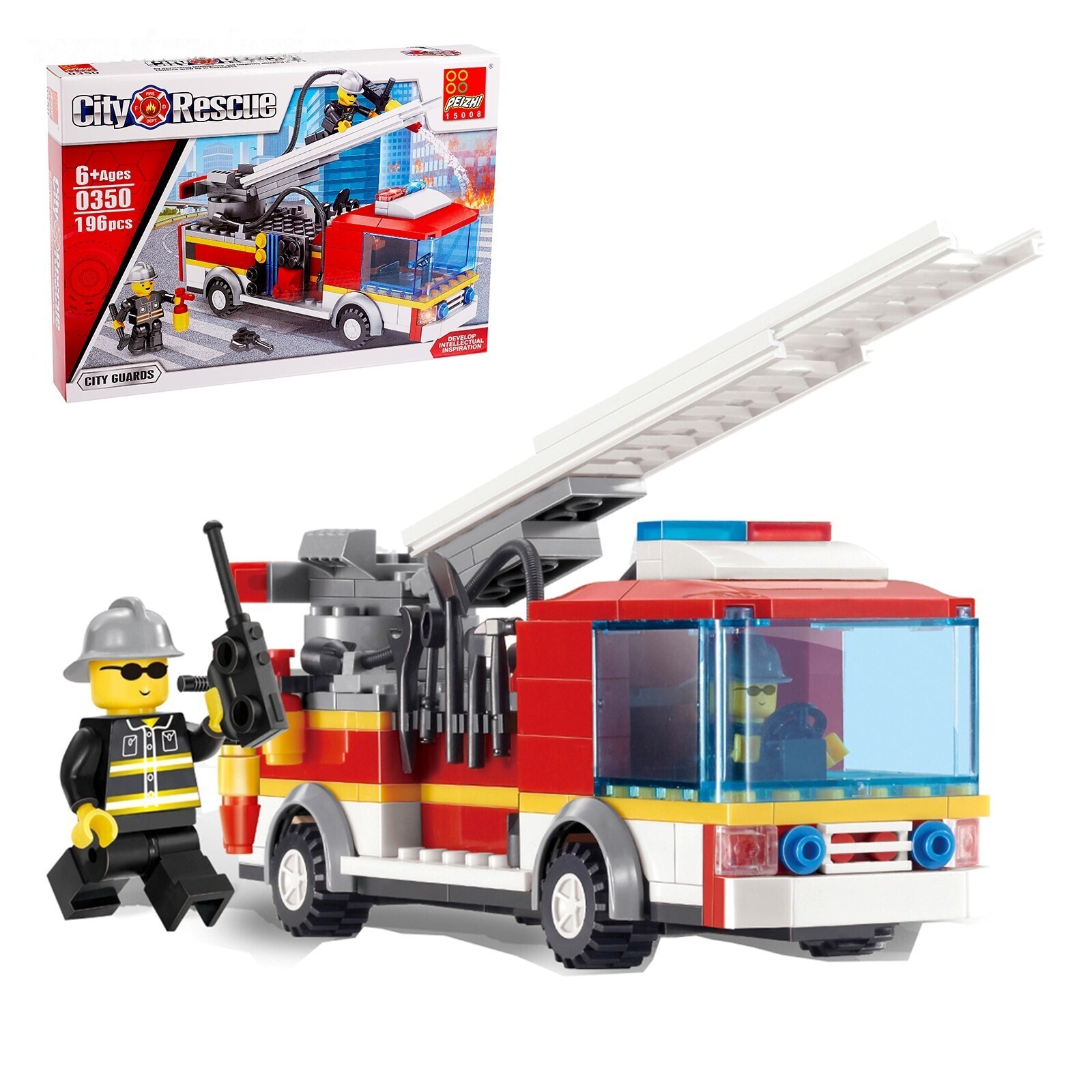 Набор содержит 196 деталей и позволяет сконструировать функциональный автомобиль спецслужбы и фигурки огнеборцев.