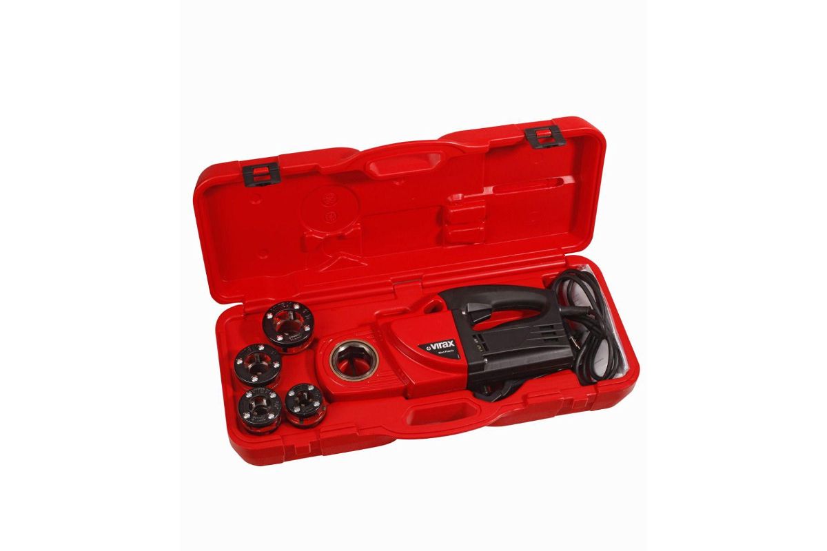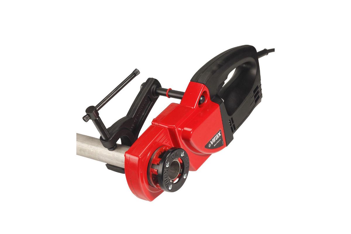 Есть возможность выбора скорости (максимальная - 20 оборотов за минуту) и направления хода. Мощный двигатель, высокая производительность и износостойкость резцов позволяют выдержать большие нагрузки даже в тяжёлых условиях. В комплект входит набор плашек (правая резьба) и тиски, помогающие зафиксировать трубу работой.