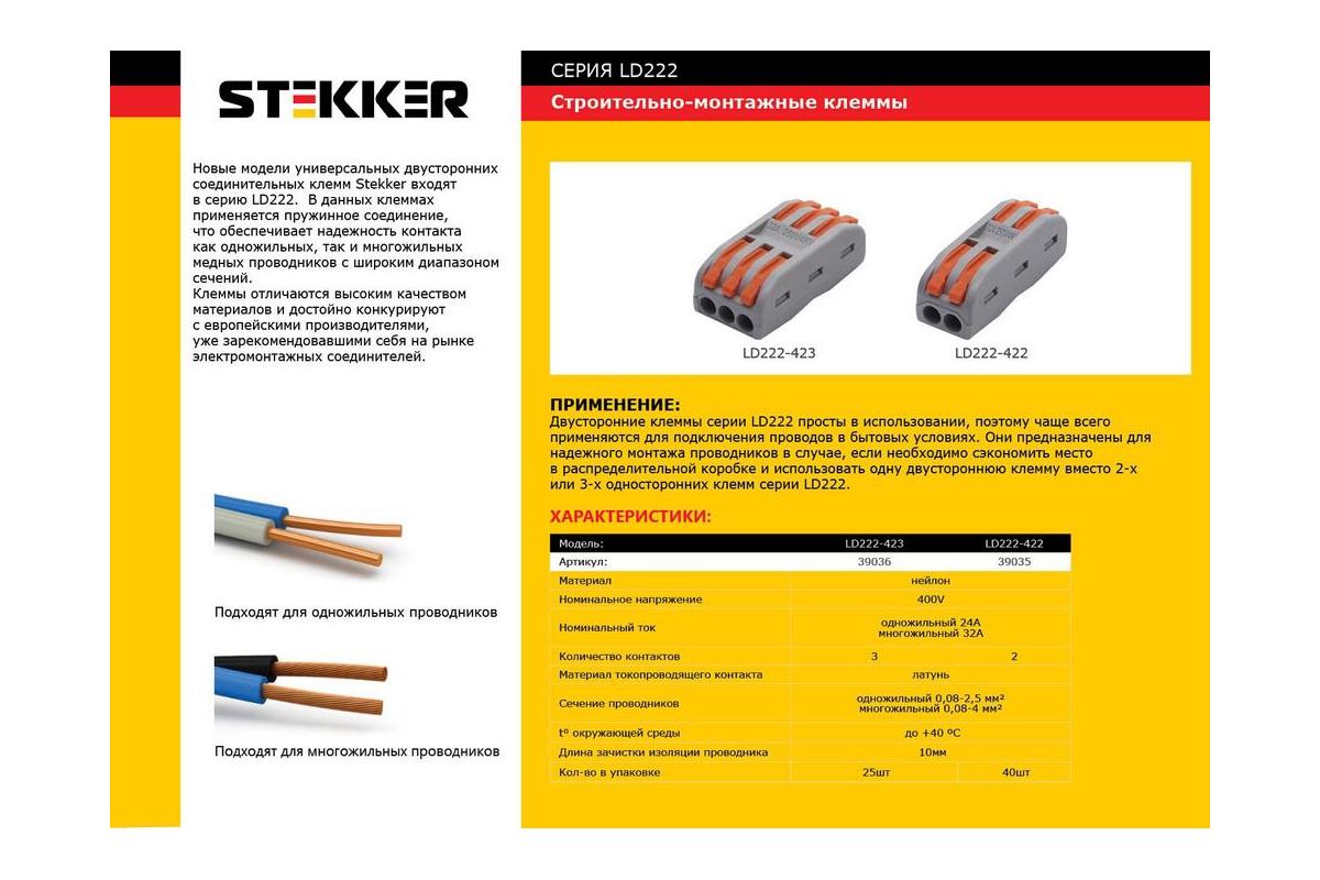 Cтроительно-монтажные клеммы STEKKER LD222-422 для подкл фаз. провод 2 полюса (цена за шт/в упак40)