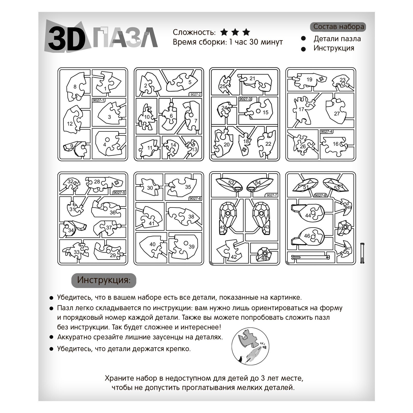 Детали пазла выполнены из полупрозрачного пластика. Элементы соединяются между собой без клея и в результате образуют объёмную фигуру.
