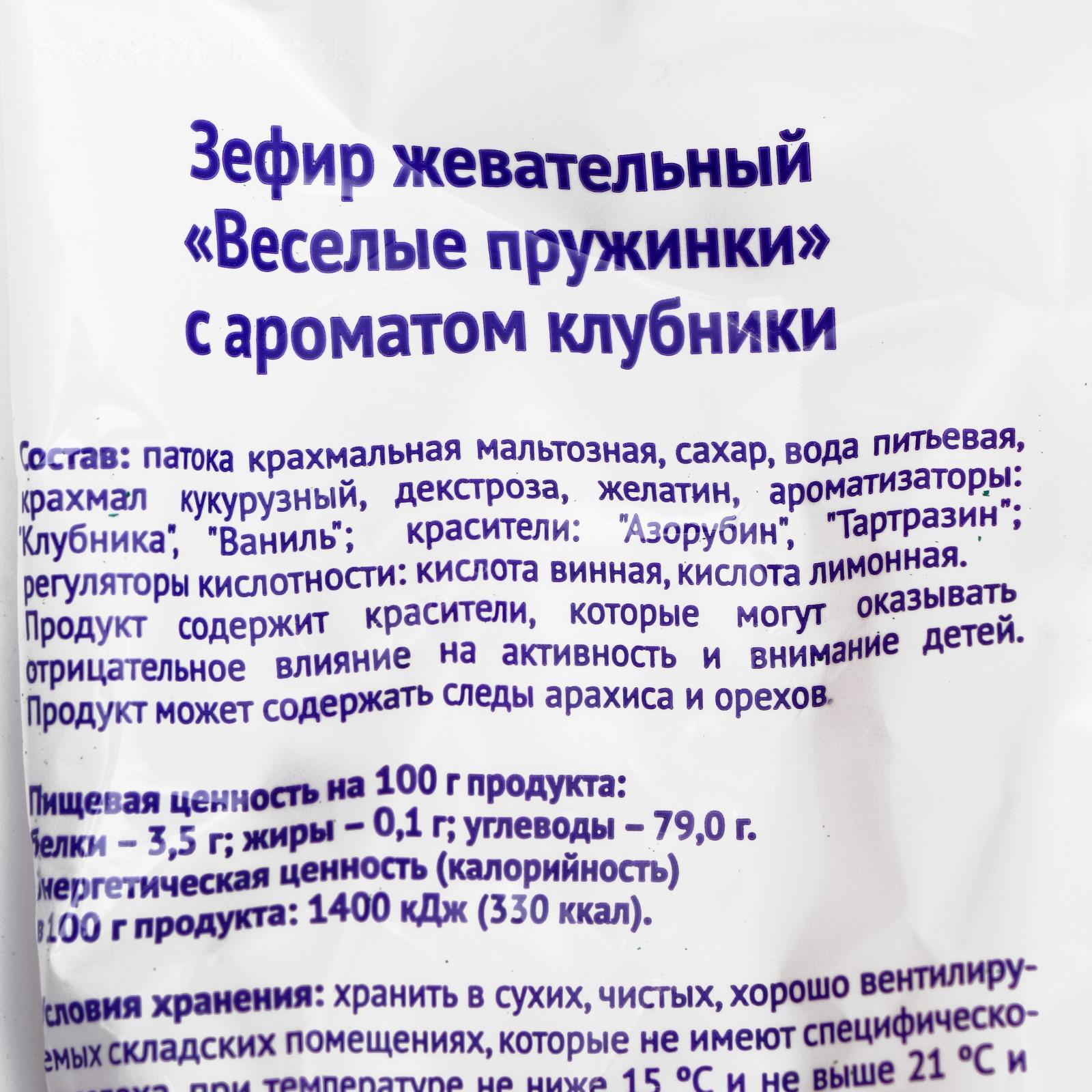 Состав: патока карамельная мальтозная, сахар, вода питьевая, крахмал кукурузный, глюкоза кристаллическая гидратная (декстроза), желатин, ароматизаторы Клубника, ваниль, красители: азорубин, тартазин, регулятор кислотности кислота винная, обсыпка: глюкоза криталлическая гидратная, регулятор кислотности кислота лимонная, ароматизатор Клубника.