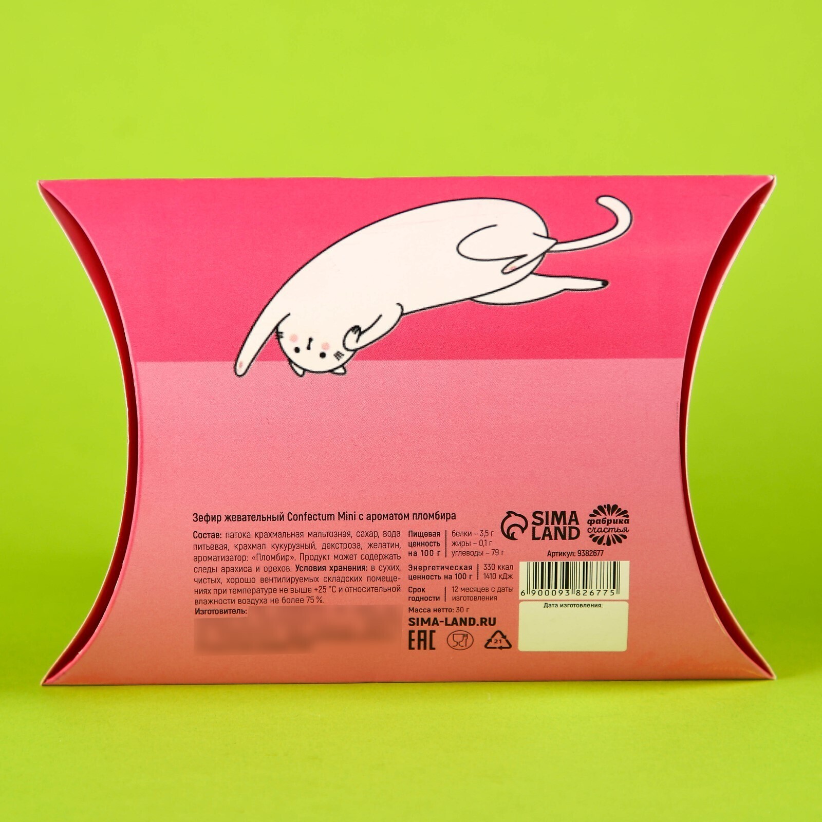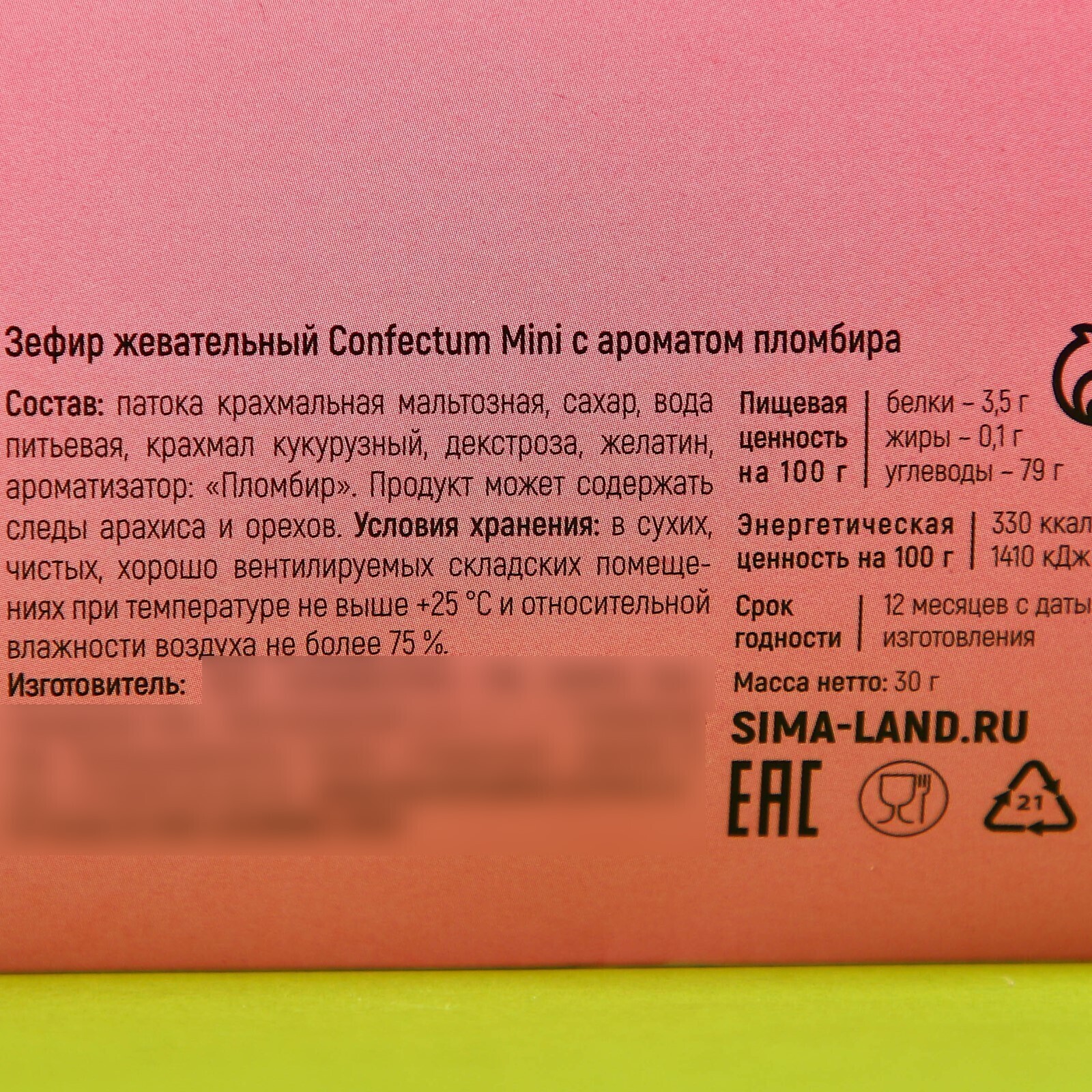 Состав: патока крахмальная мальтозная, сахар, вода питьевая, крахмал кукурузный, декстроза, желатин, ароматизатор: «Пломбир».