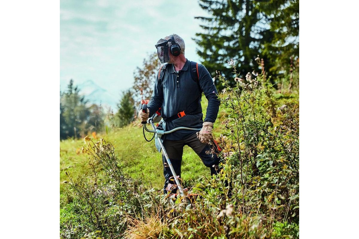За двойной ремень с мягкими накладками триммер подвешивается на плечи. Облегчает длительную работу, снижает нагрузку на руки.