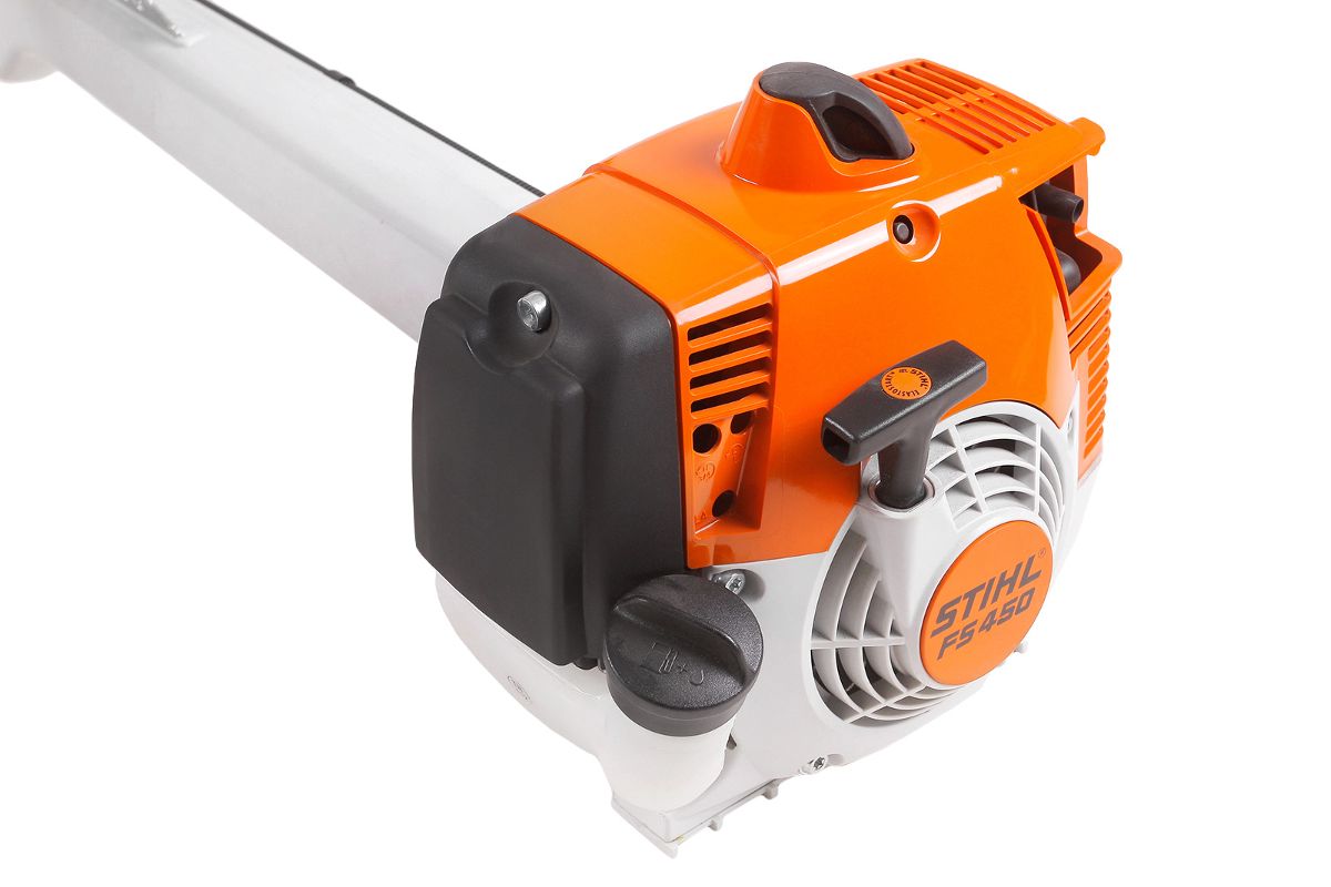 За исключением режущего оборудования и длины штанги мотокоса Stihl FS 450 K имеет все те же функции и особенности, что и модель для скашивания травы. Система «ElastoStart» и декомпрессионный клапан ускоряют процесс запуска двигателя бензопилы и делают его более простым. Одной из особенностей этой модели, связанной с тем, что она предназначена для интенсивного использования, является карбюратор с компенсатором, обеспечивающим стабильную работу даже при сильном засорении фильтра. За удобство при длительном использовании отвечает эффективная антивибрационная система, которая не допускает негативного воздействия продолжительной вибрации на здоровье пользователя. Комфортнее работу с мотокосой Stihl FS 450 K делает и эргономичная двуручная рукоятка, по форме подозрительно напоминающая велосипедный руль. Такая рукоятка намного функциональнее петлеобразной рукоятки, в том плане, что с двуручной рукояткой можно точнее контролировать каждое свое движение. Положение рукоятки можно менять. Делается это без использования дополнительных инструментов. То, что рукоятка поворачивается на 90°, упрощает транспортировку инструмента, так как делает его более компактным.