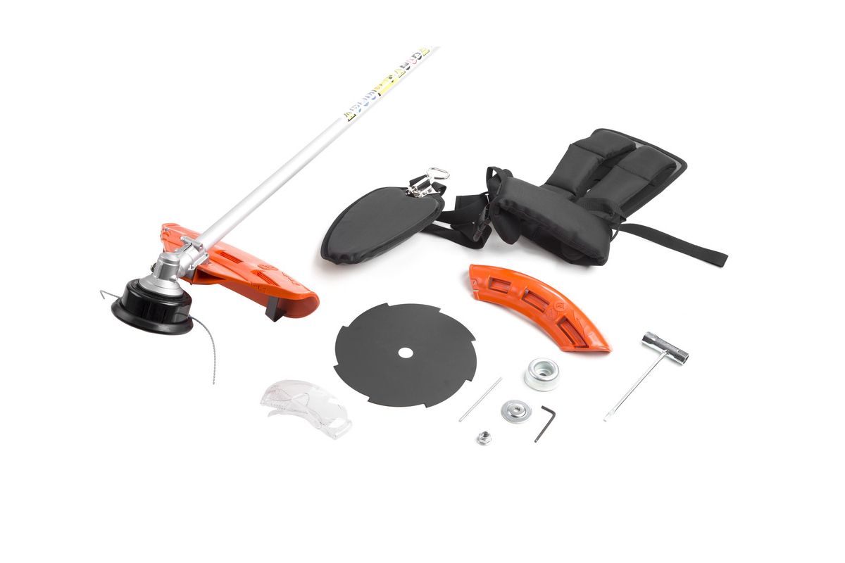 В комплекте два режущих элемента катушка с леской и металлический нож. Леска справляется со свежей травой, нож – с густыми зарослями, сорняками, кустарником и др.