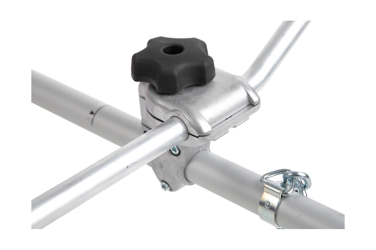 Велосипедная рукоятка с резиновыми накладками удобно лежит в ладонях. Регулируется по высоте.