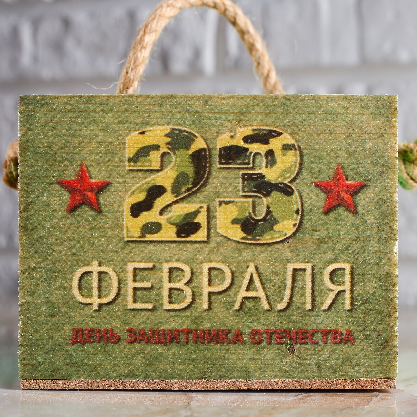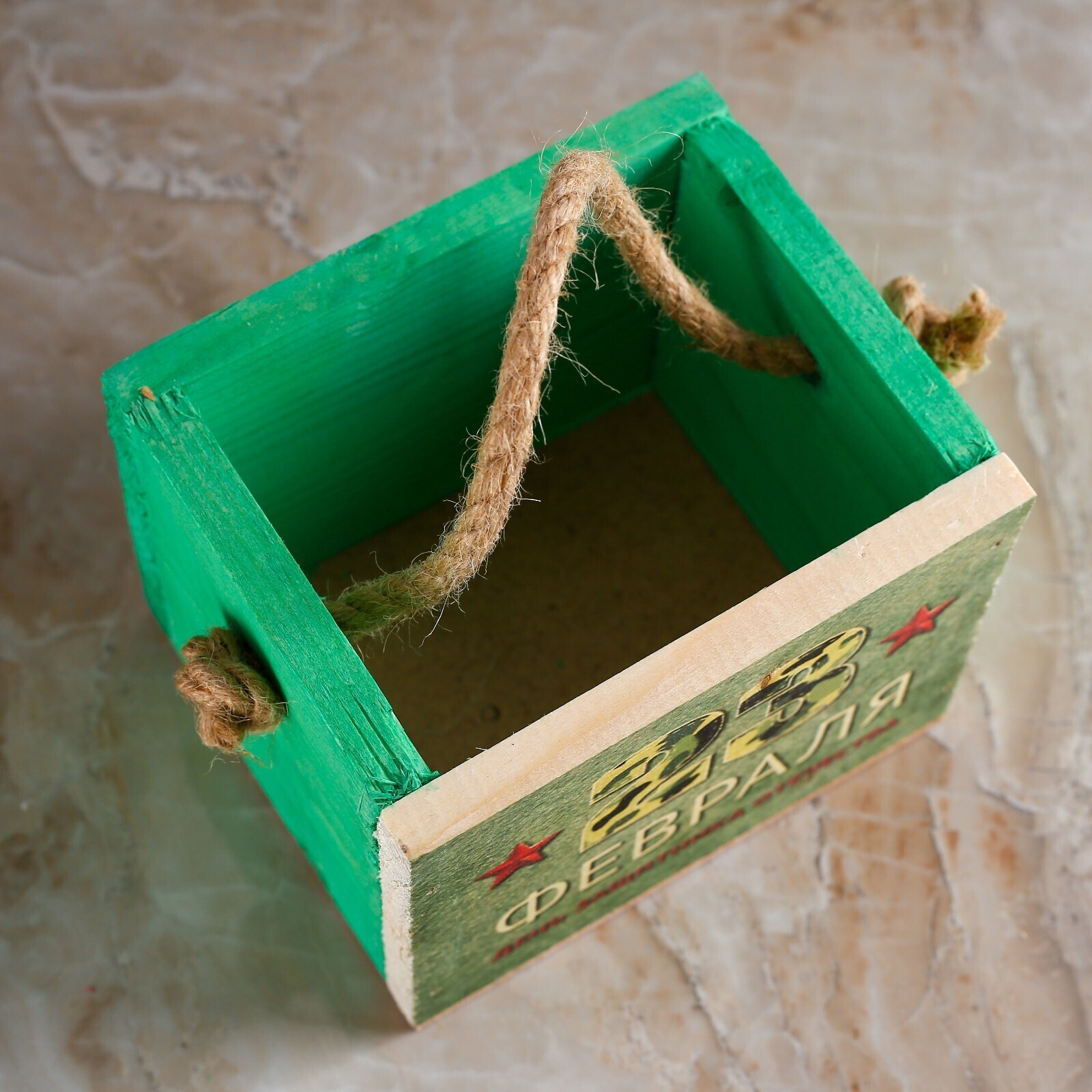 Кашпо деревянное 12.5×10.5×9.5 см Элен "23 февраля", ручка верёвка