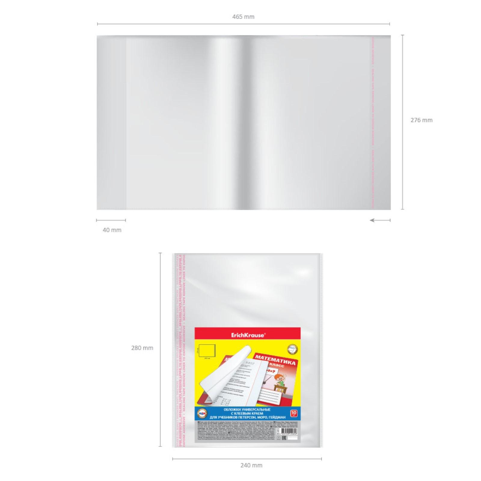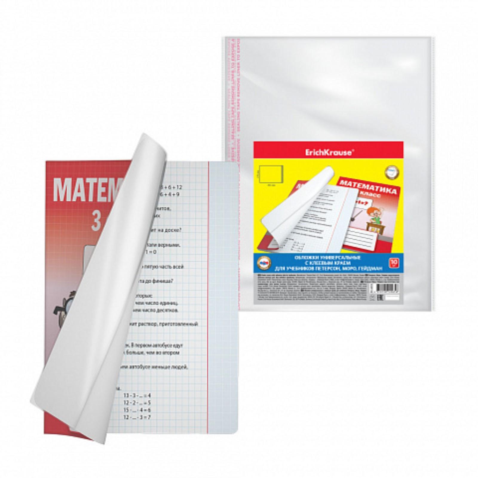 Набор обложек ПП 10 шт, 276 х 465 мм, 50 мкм, ErichKrause, Fizzy Clear, для учебников Петерсон, Моро, Гейдман, с клеевым краем, с тиснением, универсальная