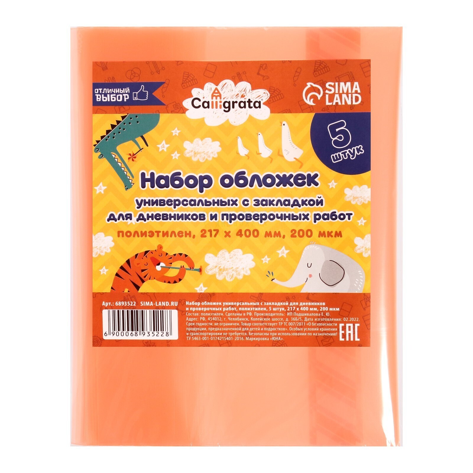 Набор обложек ПЭ 5 штук, 217 х 400 мм, 200 мкм, для дневников и проверочных работ, универсальная, с закладкой, МИКС
