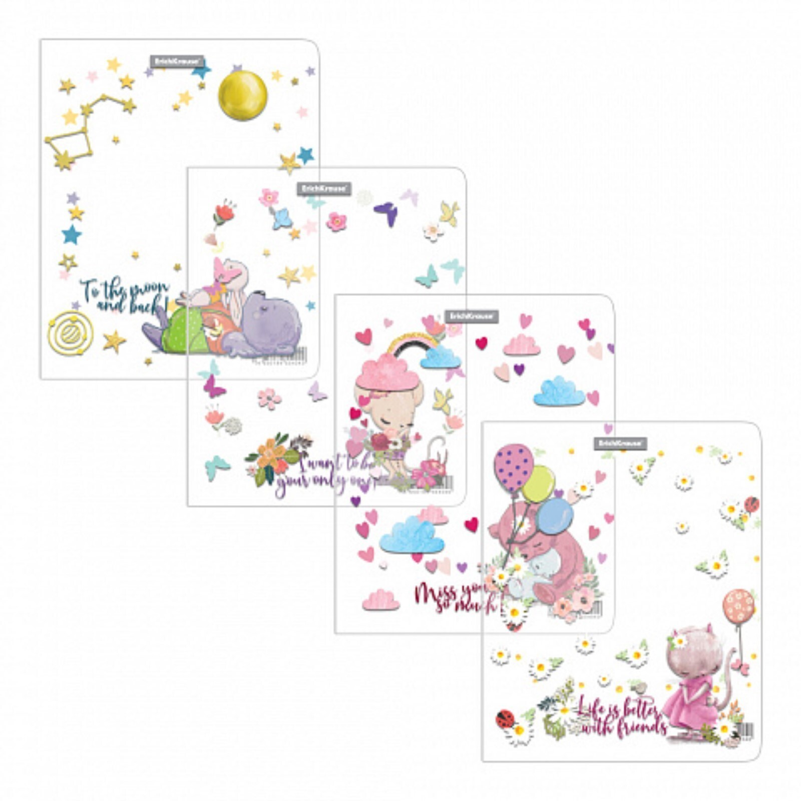 Обложка из высококачественного пластика с особо прочными швами и текстурой поверхности "зеркало". Надежно защищает тетради и дневники от повреждений. В наборе представлено 4 дизайна обложек из коллекции по 3 штуки. Гарантированно подходит для продукции ErichKrause.