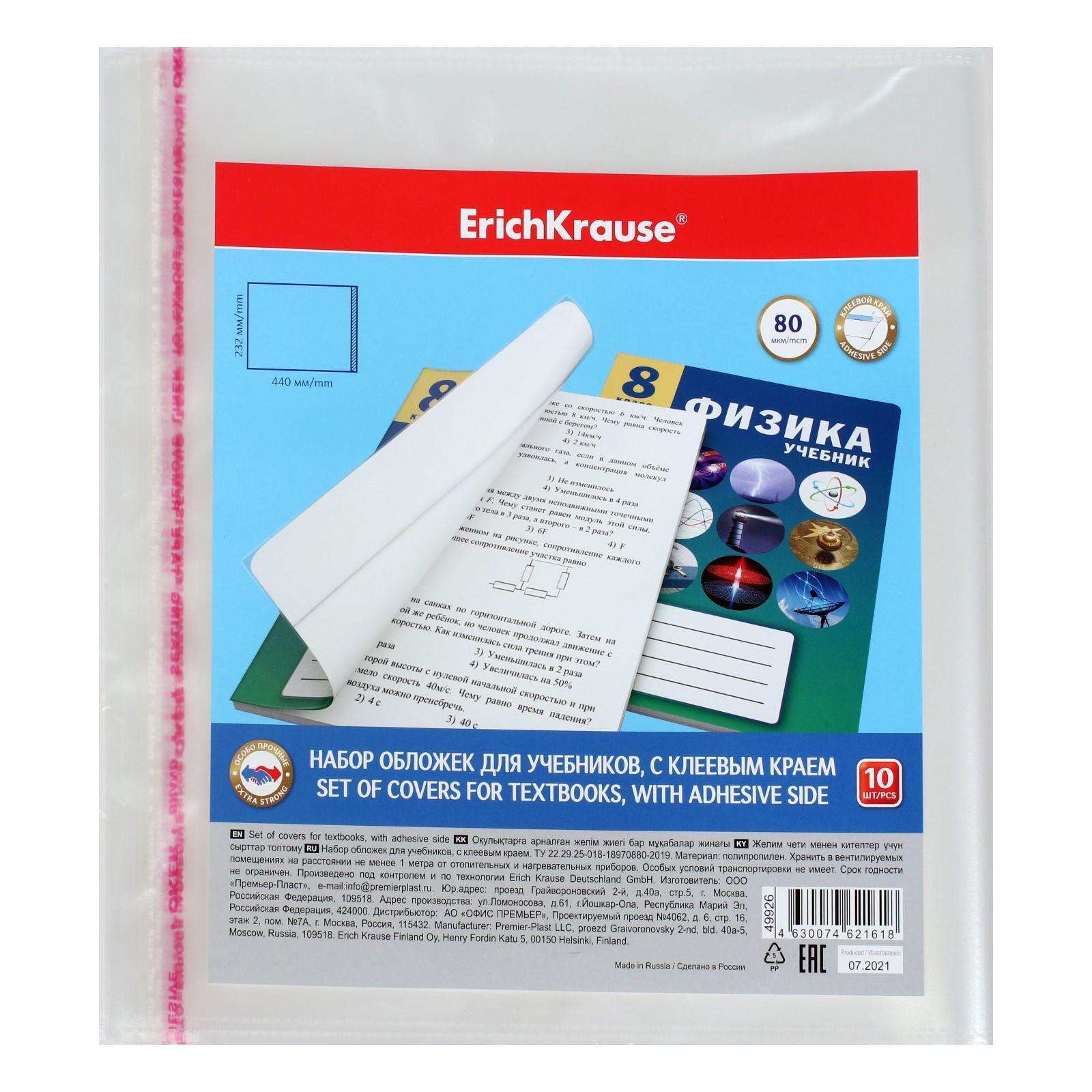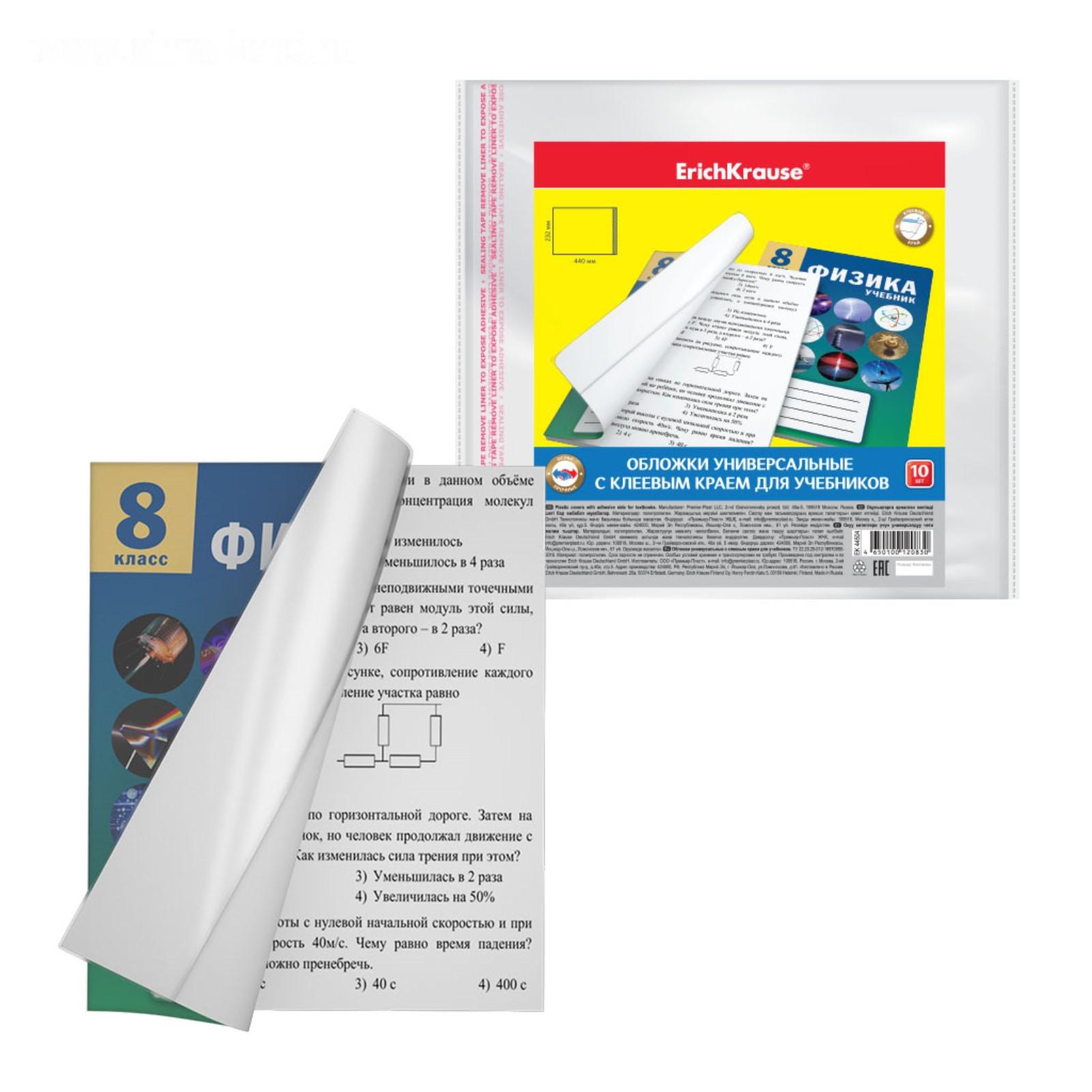 Набор обложек ПП 10 шт, 232 х 440 мм, 80 мкм, ErichKrause "Fizzy Clear", для учебников, с клеевым краем, с тиснением