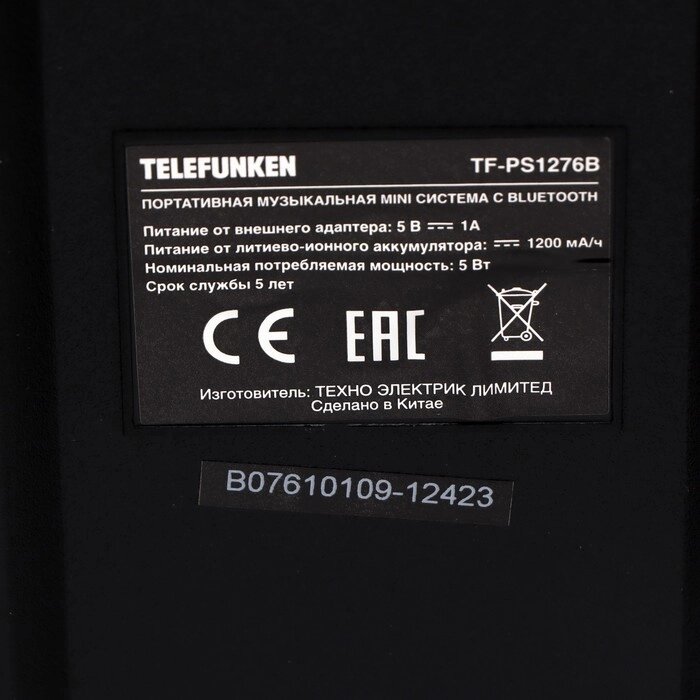 Портативная караоке система Telefunken TF-PS1276B, 35 Вт, FM, AUX, USB, BT, 1200 мАч, чёрная