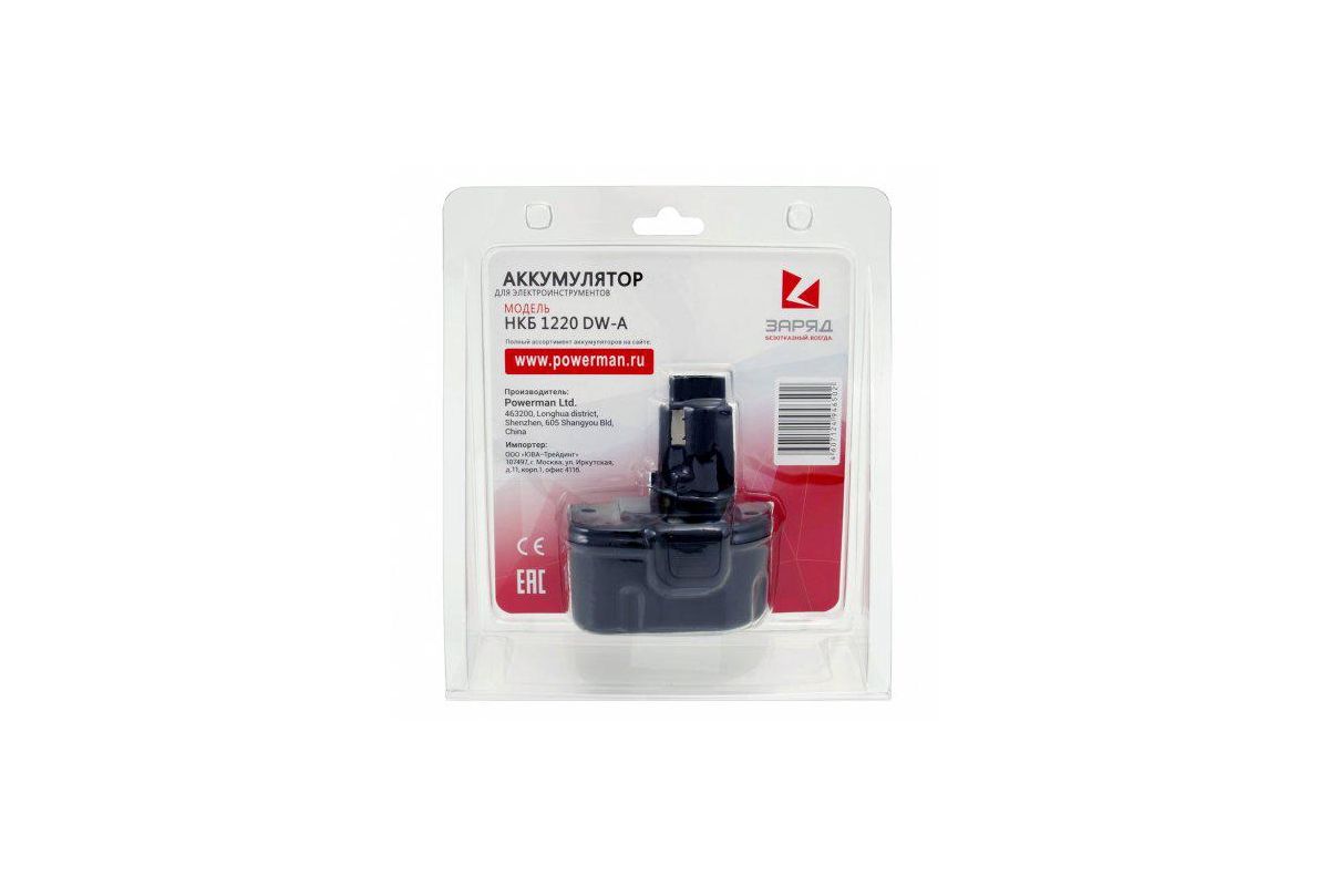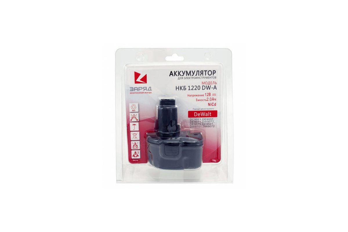Аккумулятор ''ЗАРЯД'' НКБ 1220 DW-A - Сменный АКБ для инструмента DeWalt 12.0 В, 2.0 Ач, NiCd. Элементы: 10 шт. х HYCPSC2000N (герметичные, цилиндрические, размер – SC, химия: Ni-Cd). Соответствие моделям аккумуляторов: DC9071,DE9037, DE9071, DW9072, DE9075, DE9501, DW9071, DW9072. Модели инструментов, для которых подходит данная модель аккумулятора ''ЗАРЯД'': DC540, DC540K, DC524, DC524K, DC727KA, DC740K, DC742KA, DC742VA, DC743KA, DC743KB, DC840KA, DC840KB, DC841KA, DC845KA, DC845KB, DC940KA, DC940KB, DC945KB, DC980, DC981, DC981K, DCD910KX, DCD940B2, DCD945B2, DW051, DW052, DW052K, DW053, DW053K2, DW904, DW904K, DW907, DW912, WD915, DW924K-B2, DW924-B3, DW924K2AR, DW924K2B2, DW924K2B3, DW924K2BR, DW927K2, DW927KV-2, DW940K-2, DW953, DW956K2, DW965, DW968K2, DW970, DW971K2, DW972, DW972B, DW972K, DW972KQ2, DW972KS-2, DW972RLK2, DW974K, DW974K2, DW974KQ, DW975B, DW975K, DW976K, DW977B, DW977K, DW979, DW979K, DW979K2, DW979K2-BR, DW980, DW981