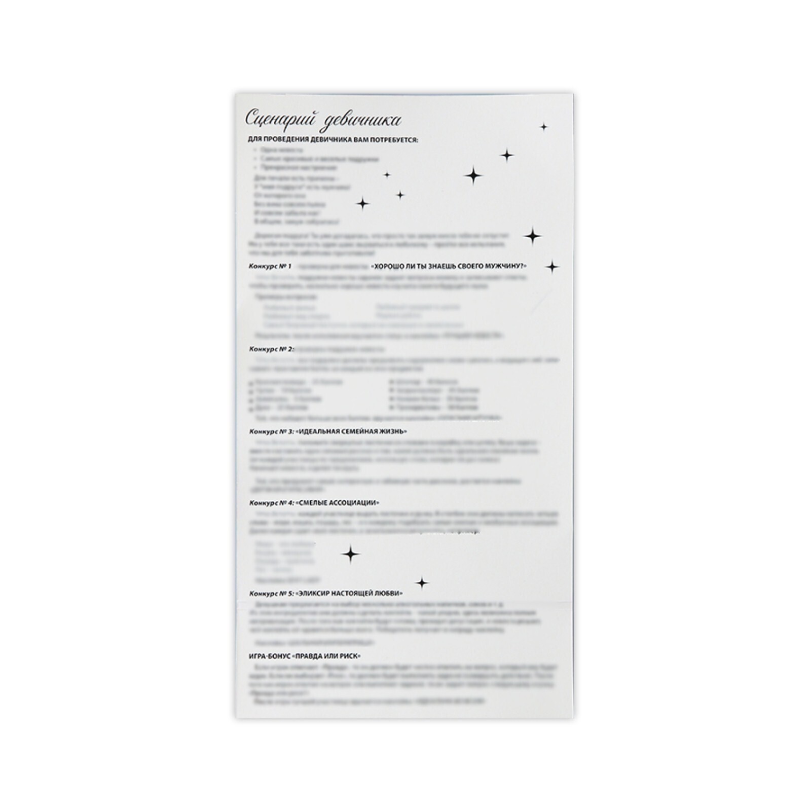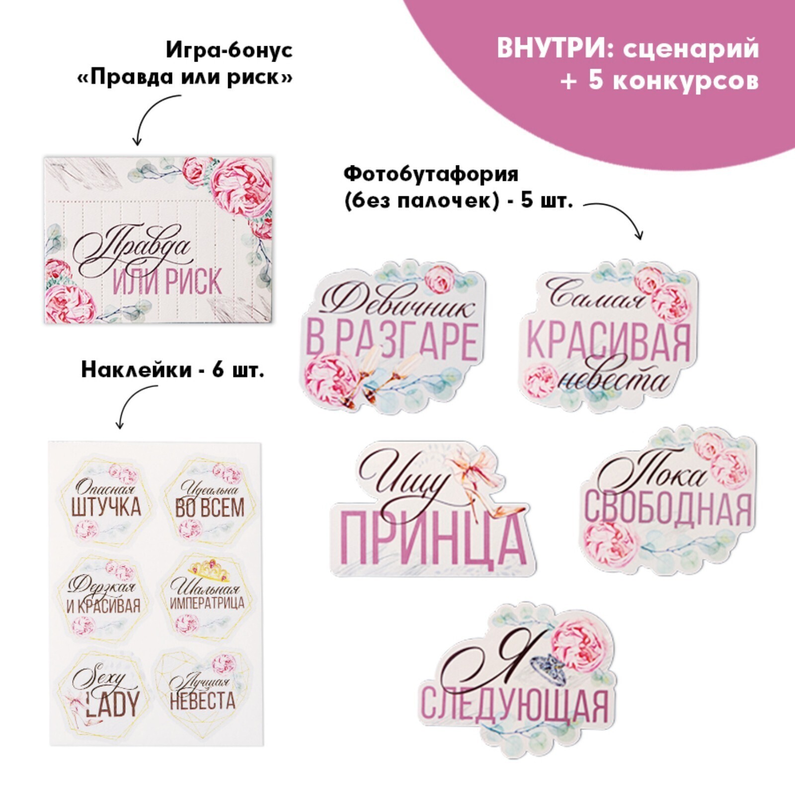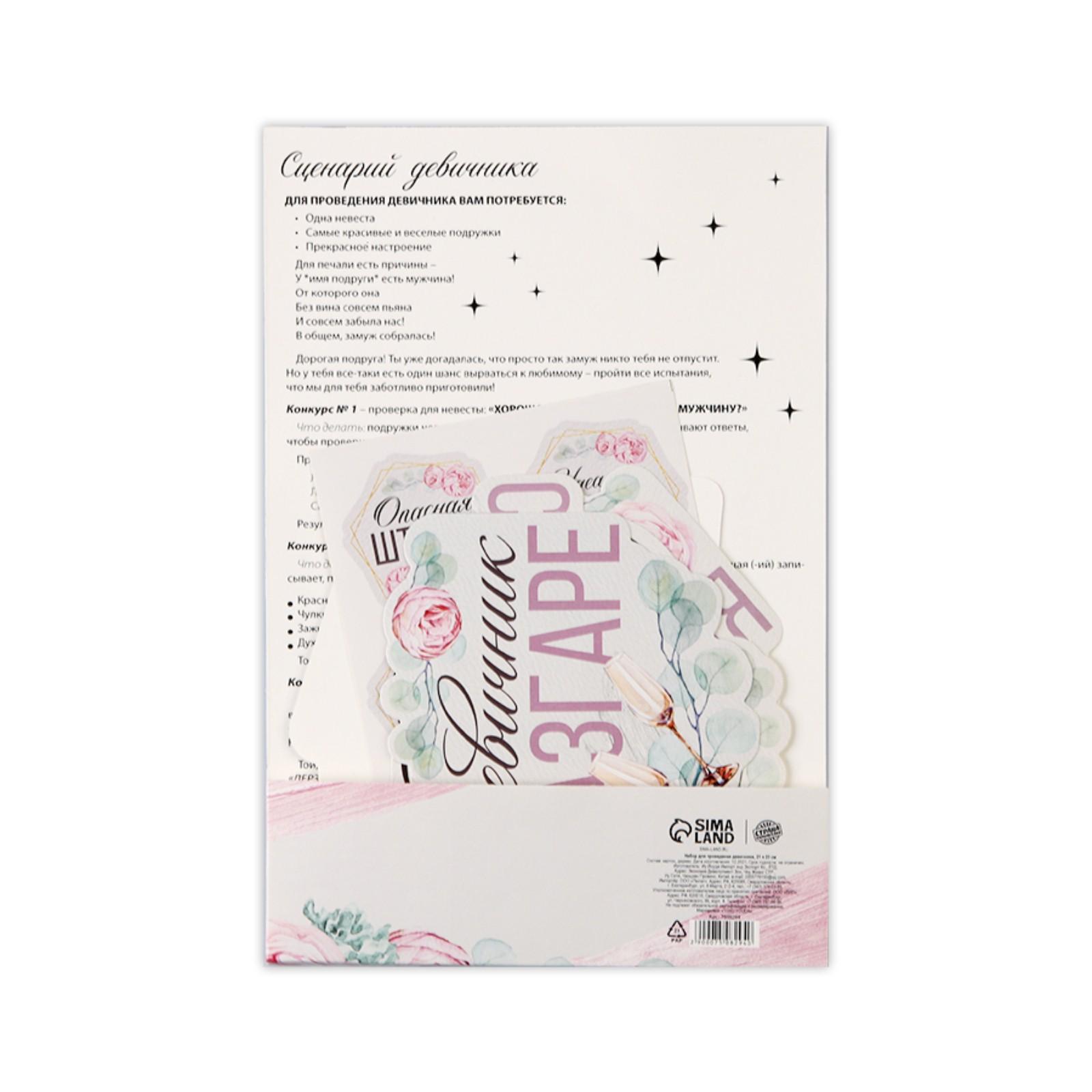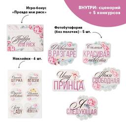 Устройте самый веселый, яркий и неповторимый праздник для невесты, который останется в памяти надолго. Набор для проведения девичника идеален для домашней вечеринки. Эта игра поможет отметить его весело, душевно и незабываемо. Подготовьте для каждой участницы любимые напитки и прекрасное настроение! Игра предусмотрена на 6 участниц, но по желанию можно увеличить количество человек. Сценарий включает в себя 5 конкурсов/игр, также в наборе вы найдёте аксессуары для фотосессии 6 штук, наклейки 6 штук. Бонусом для вас станет игра "Правда или риск".