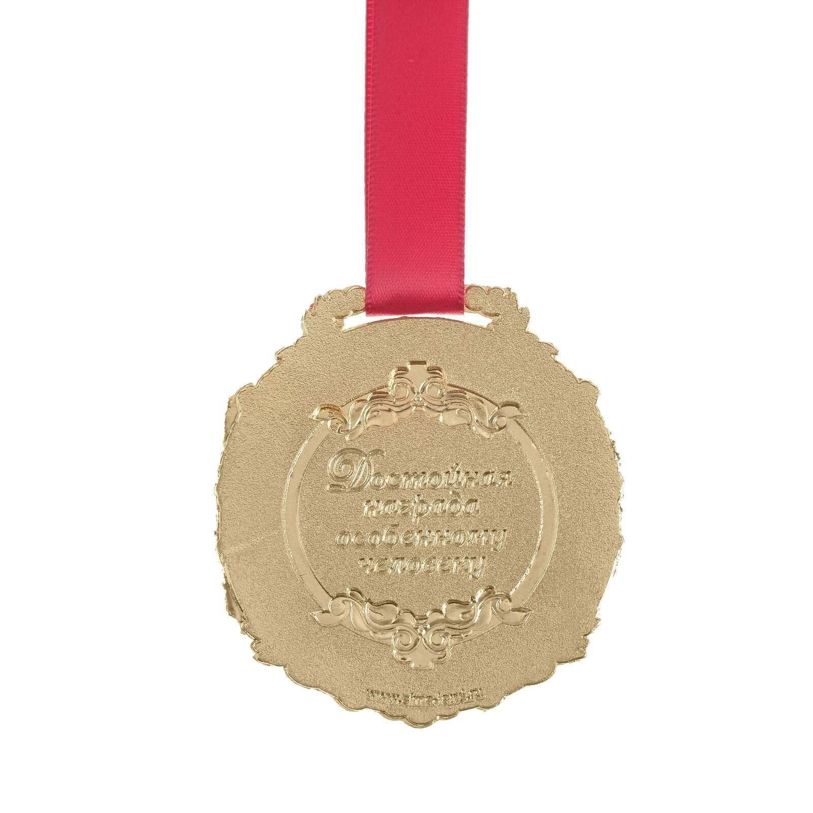 Медаль изготовлена из фигурного металла золотистого цвета, декорирована цветной вставкой с акриловым покрытием, что предотвращает её потускнение. Награда упакована в бархатную подарочную коробку, идет в комплекте с лентой.