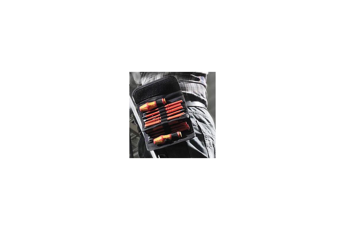 - 15 сменных отверток VDE и 2 ручки-держателя 817 VDE Kraftform в прочной поясной сумке;