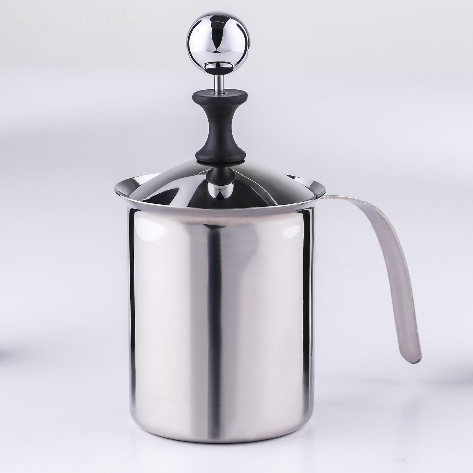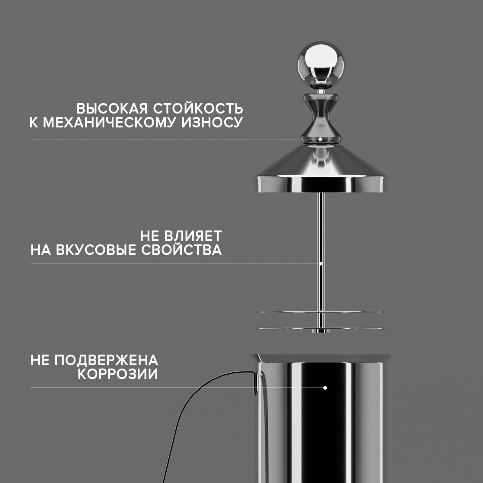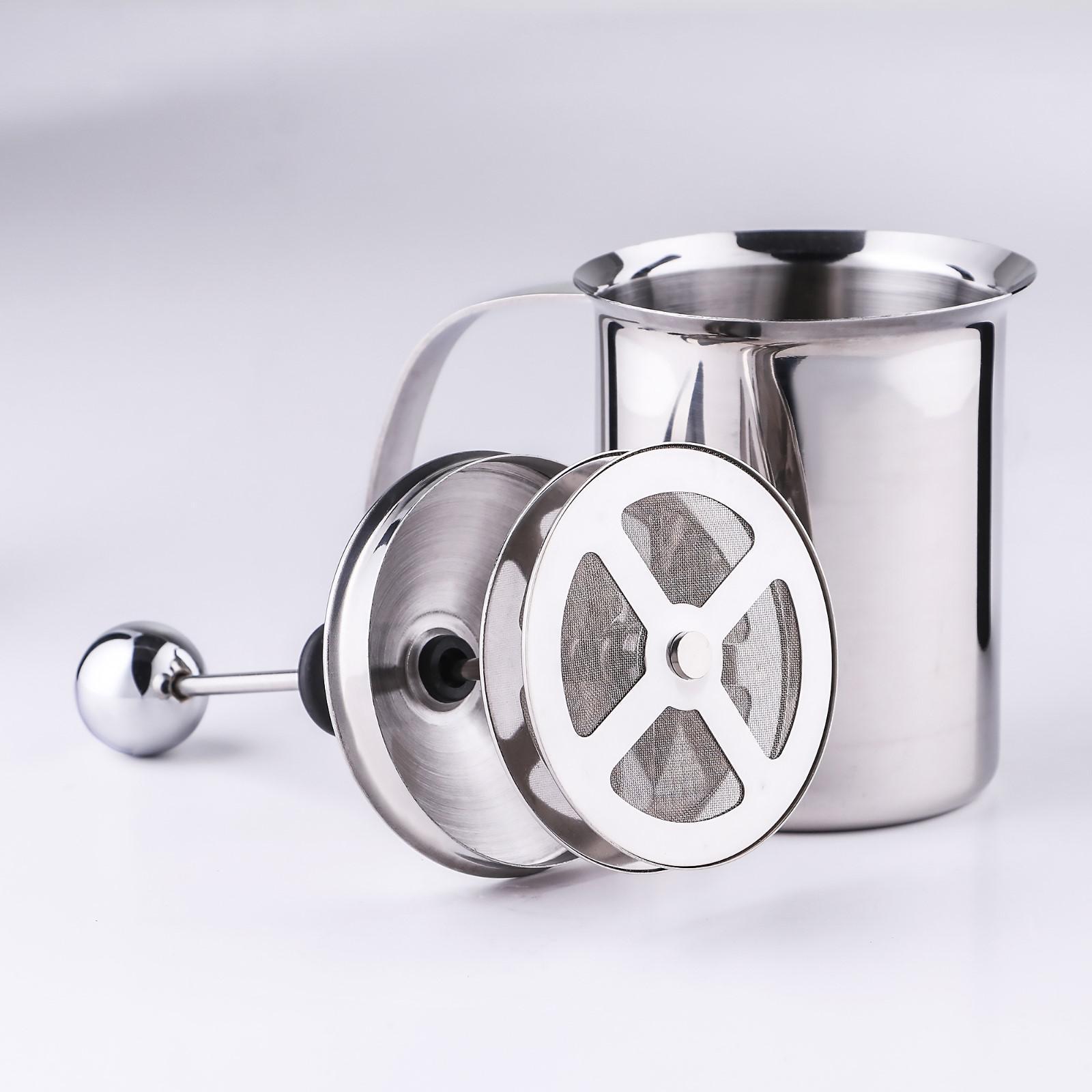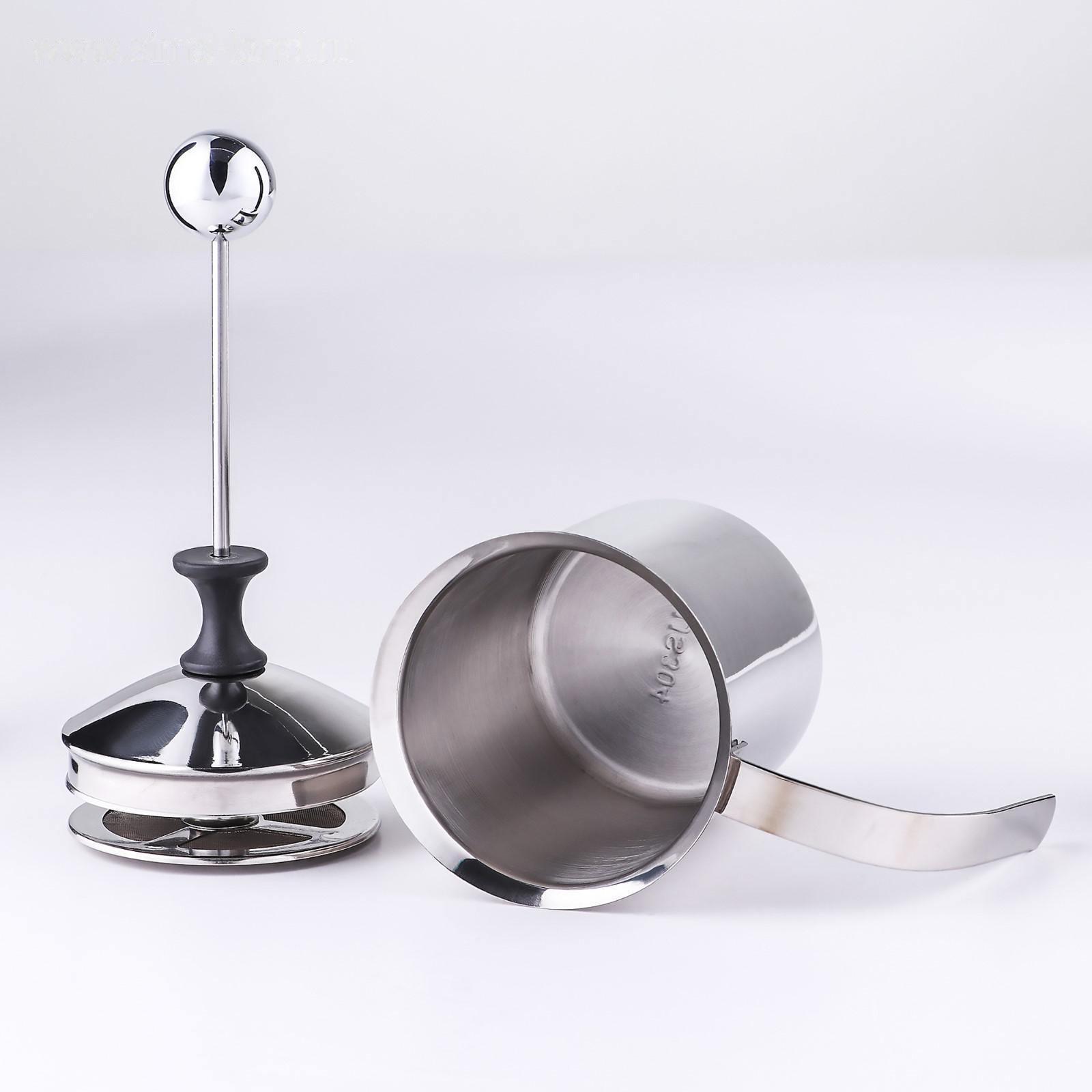 Молочник с ручным поршнем для взбивания придётся по вкусу любителям кофейных и молочных напитков. Изготовлен из нержавеющей стали, которая обеспечивает высокую стойкость к механическому износу, не подвержена коррозии, а также не влияет на вкусовые свойства. Материал равномерно распределяет тепло, обладает быстрой теплопроводностью. Молочник имеет термостойкую ручку и удобную крышку. С помощью двойной сетки молоко или сливки превратятся в пышную пену гораздо быстрее.