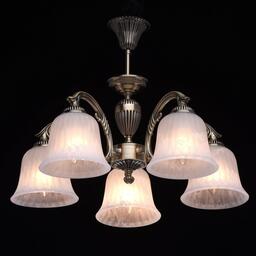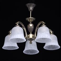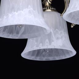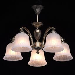Основание: комбинация сплавов металлов, гальванизировано в цвет античной бронзы с патинированием и лакированием. Потолочная чаша, декоративные розетки, центральный стержень, корпус: металл, прессование. Рожки: сплав алюминия, художественное литье. Плафон: алебастровое стекло, отлит в сложную форму, матирован.