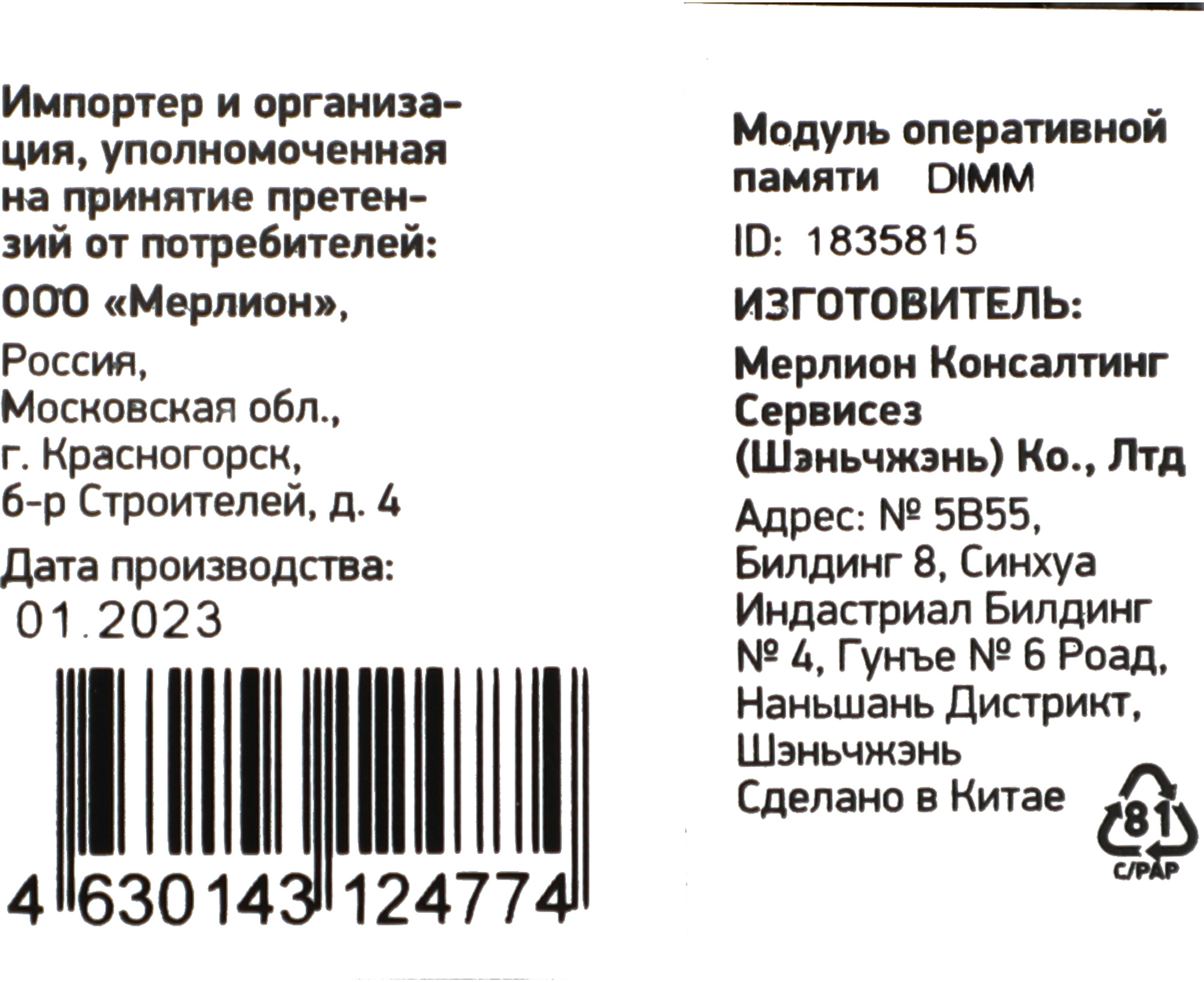 • EAN код 4630143124774