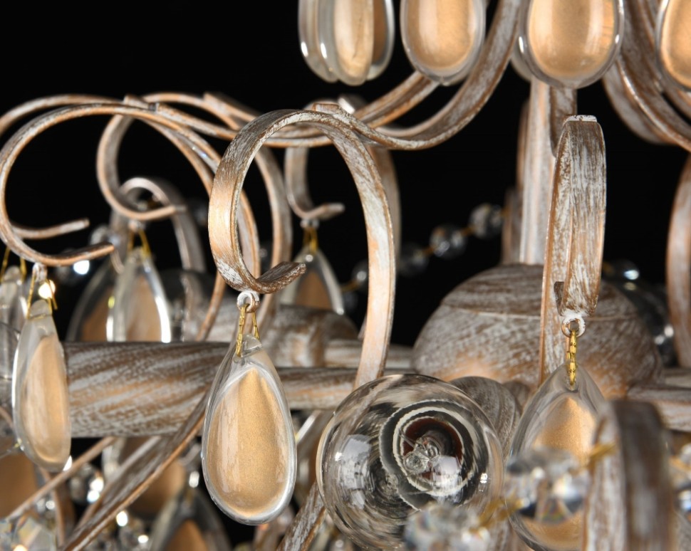 Серия Charbol заслуживает особого внимания благодаря интересному цветовому совмещению отделки арматуры, каплевидным кристаллам из акрила, а также бусинам, которые образуют живописную композицию.